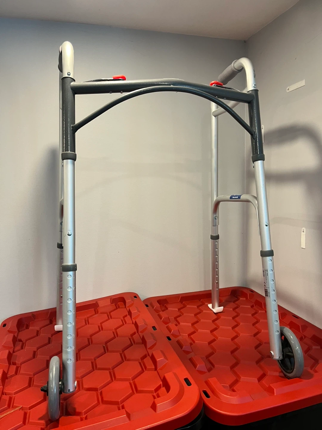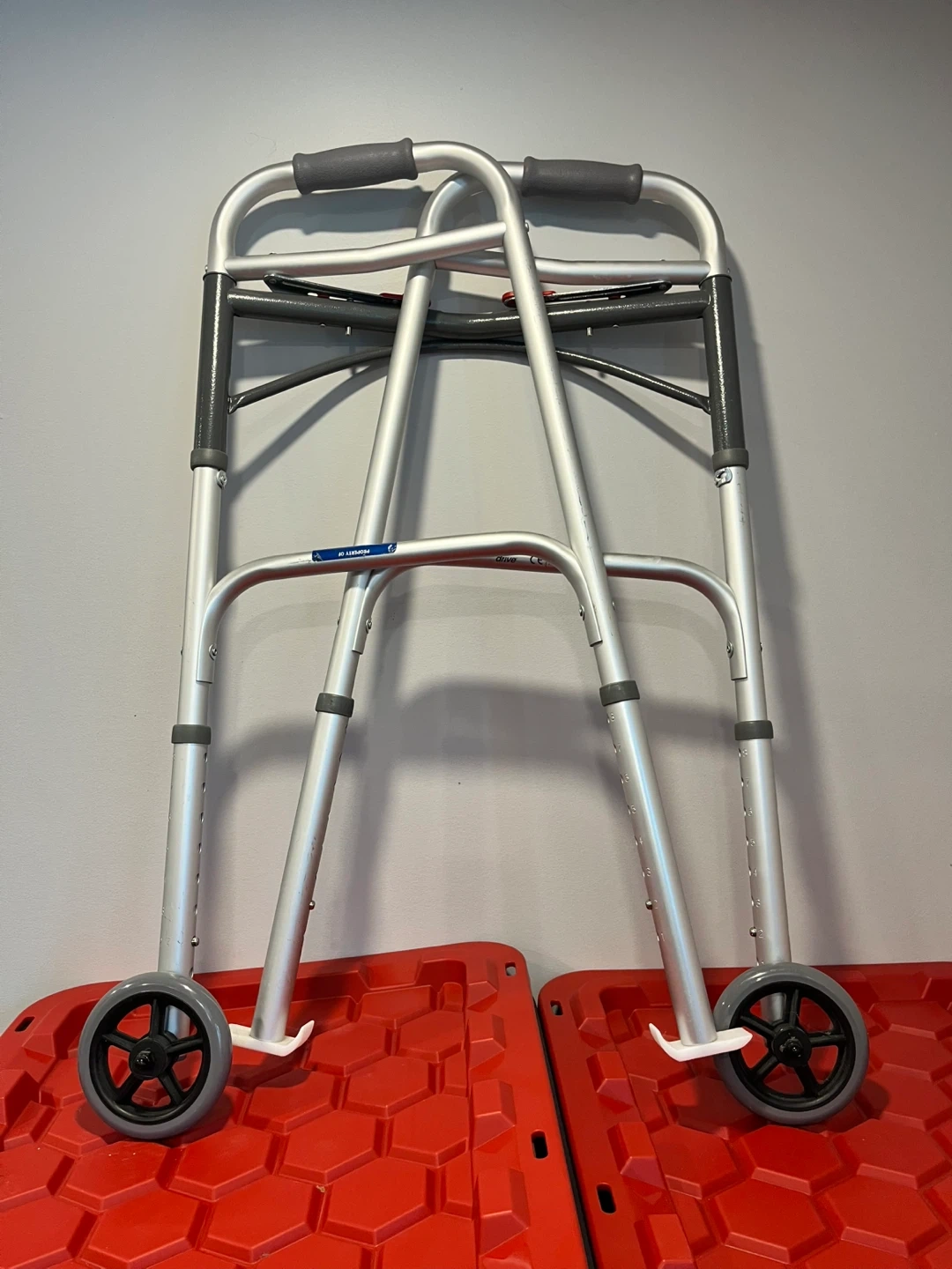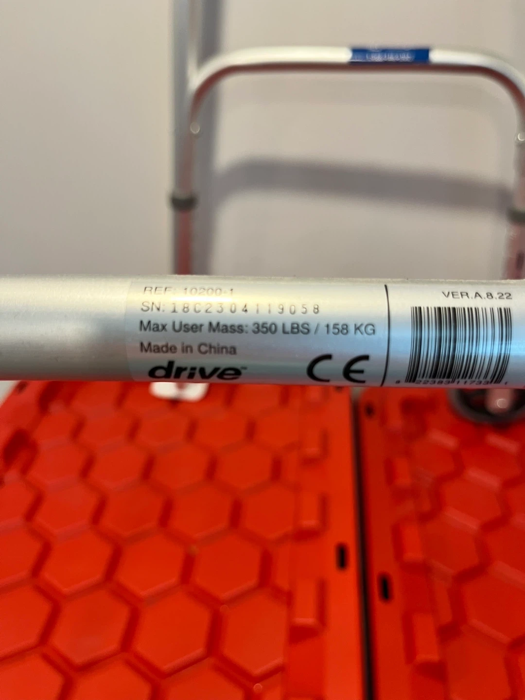 This Drive walker is foldable for easy storage. It has adjustable height settings and a maximum user weight capacity of 350 lbs (158 kg). It comes with front wheels for added mobility. Manufactured in China.