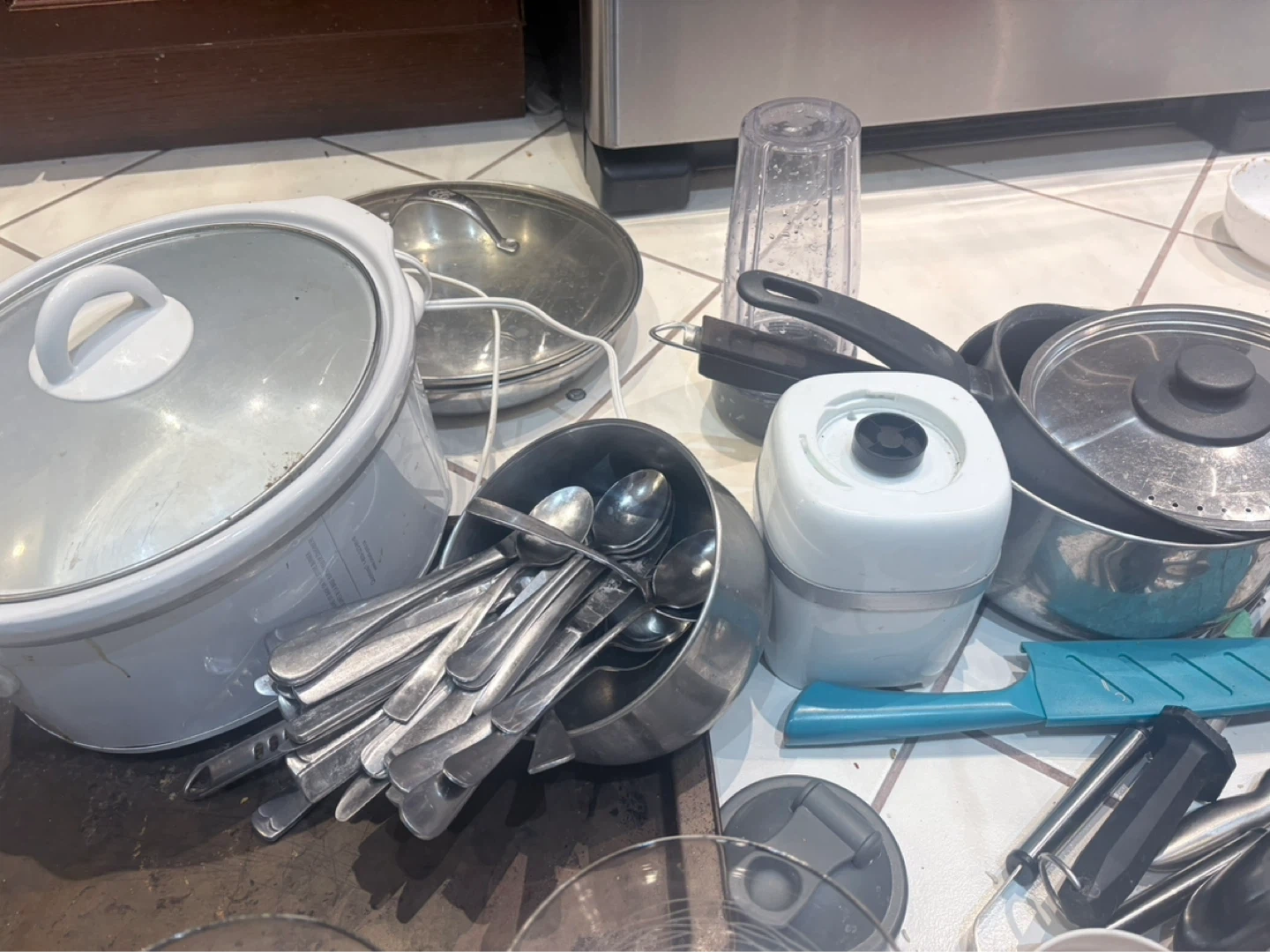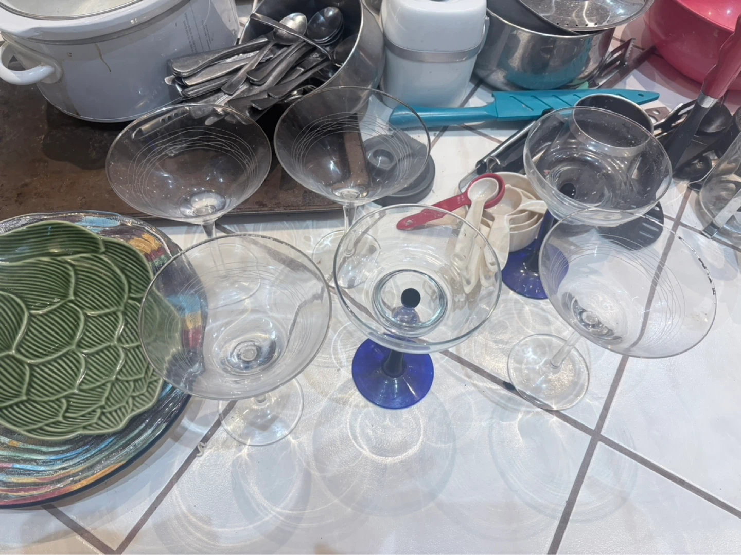 Assorted kitchen items including pots, pans, various glasses, and a collection of utensils. Some items are decorative, like the green artichoke dish. This lot is great for stocking a new kitchen or replacing worn-out pieces.