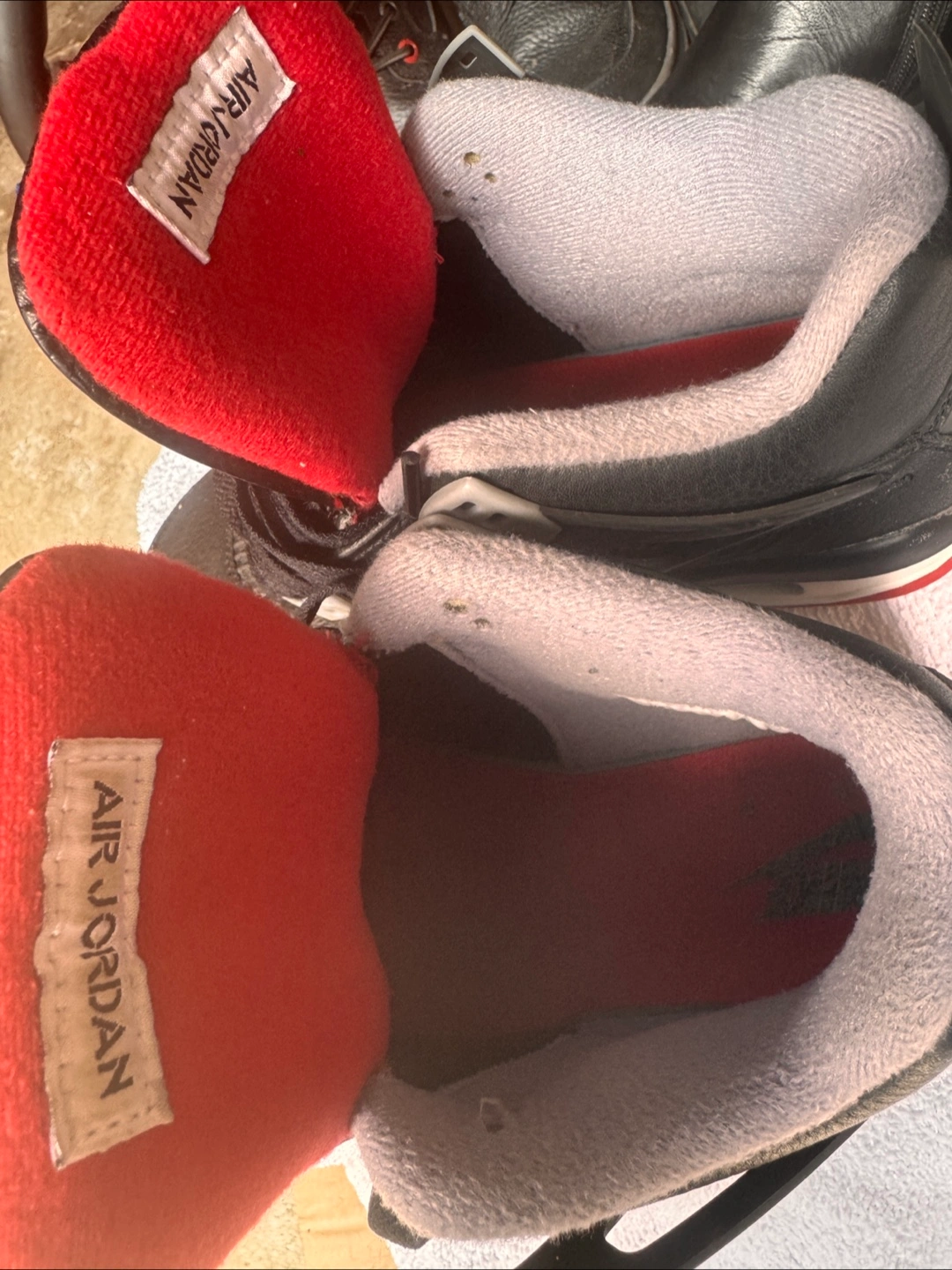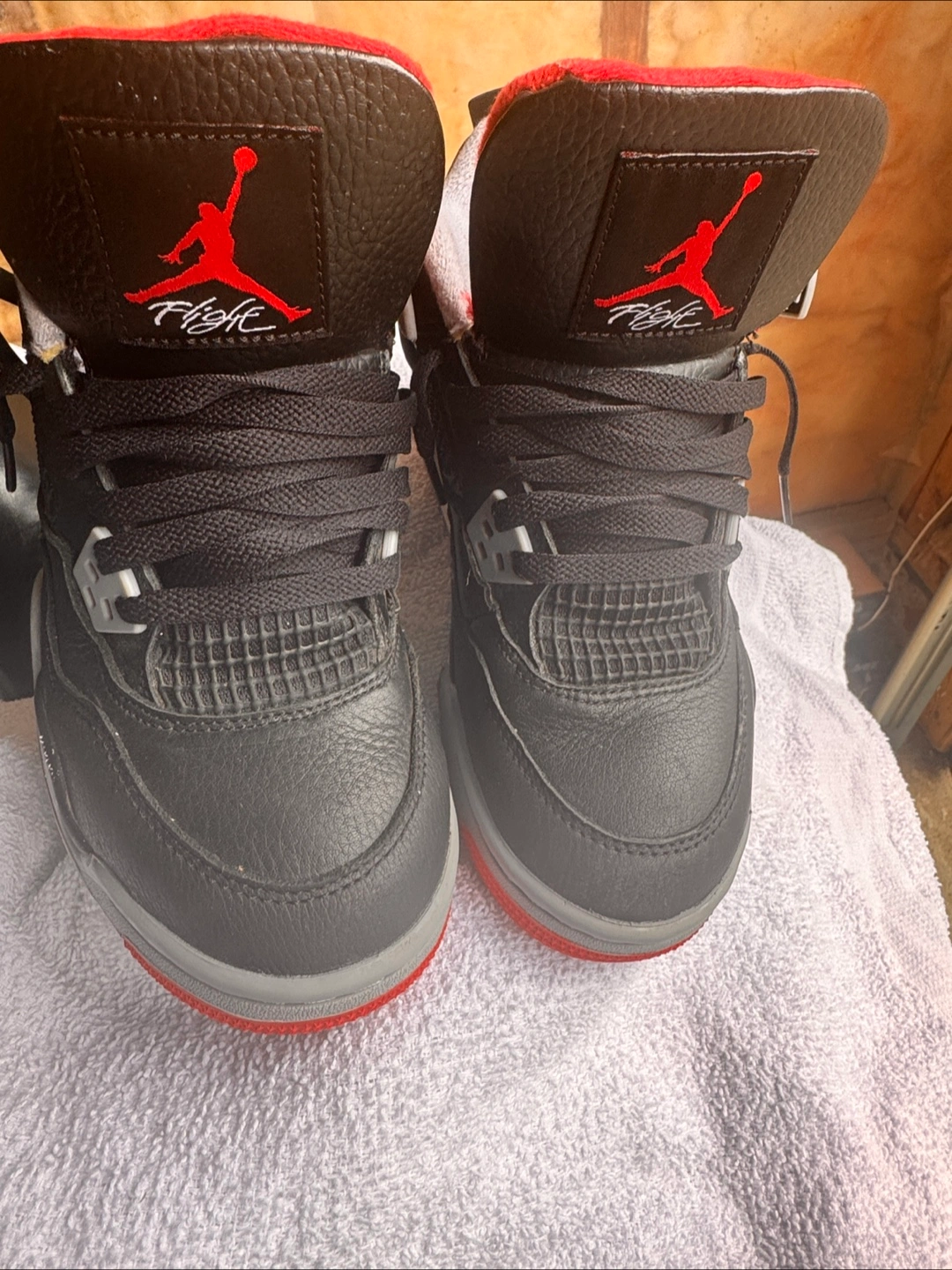 Selling a pair of Air Jordan 4 Retro sneakers in black and red. They show some signs of wear but still have lots of life left in them!