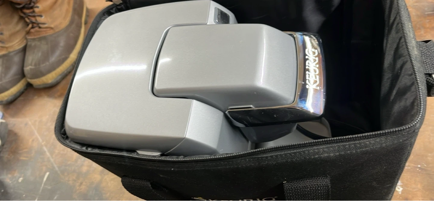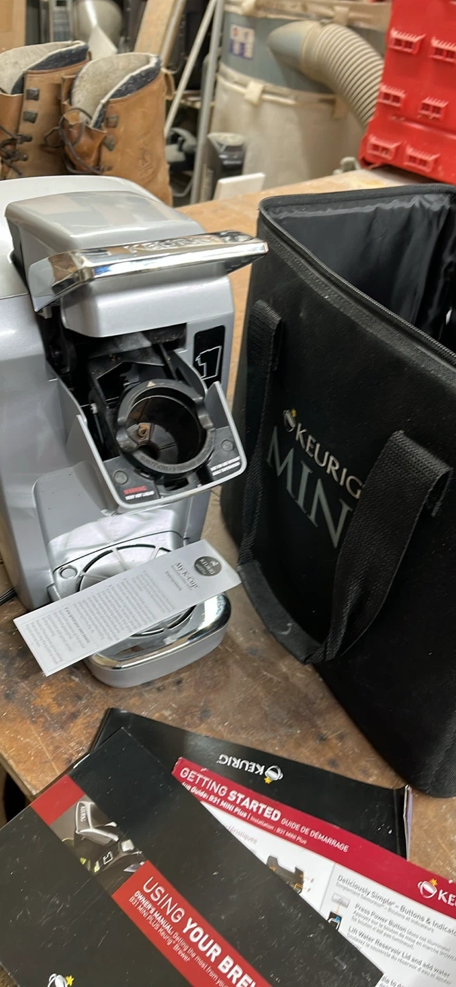 This Keurig Mini Plus coffee brewer is silver and comes with its original carrying bag and manuals. It's compact for easy storage and use.