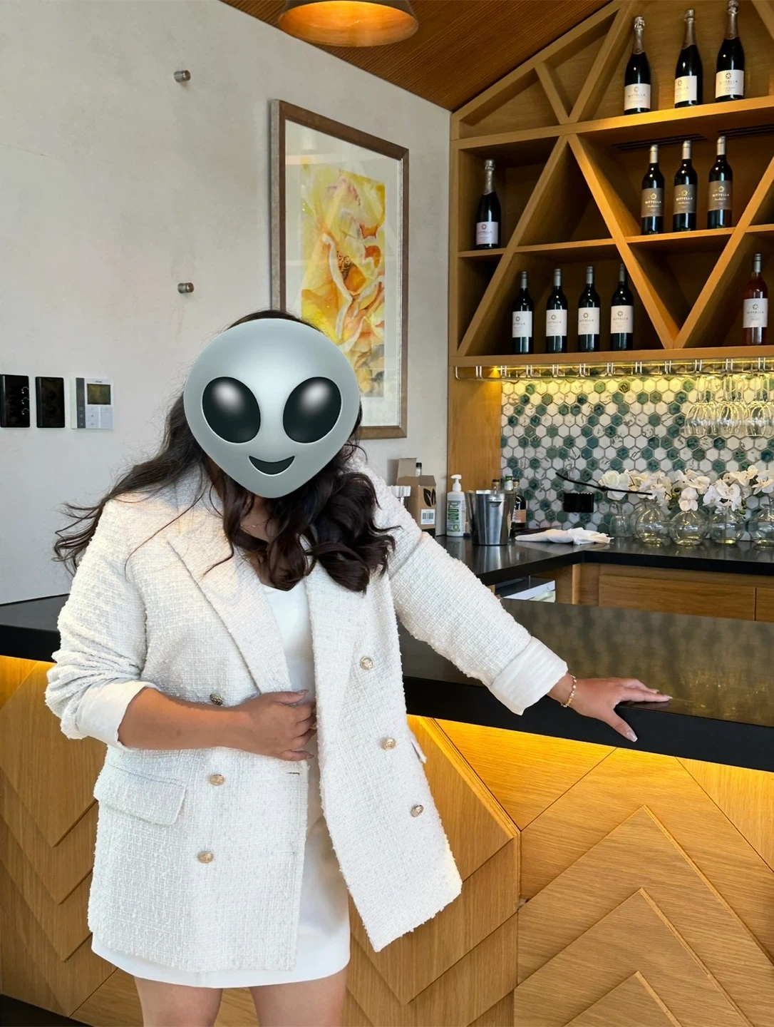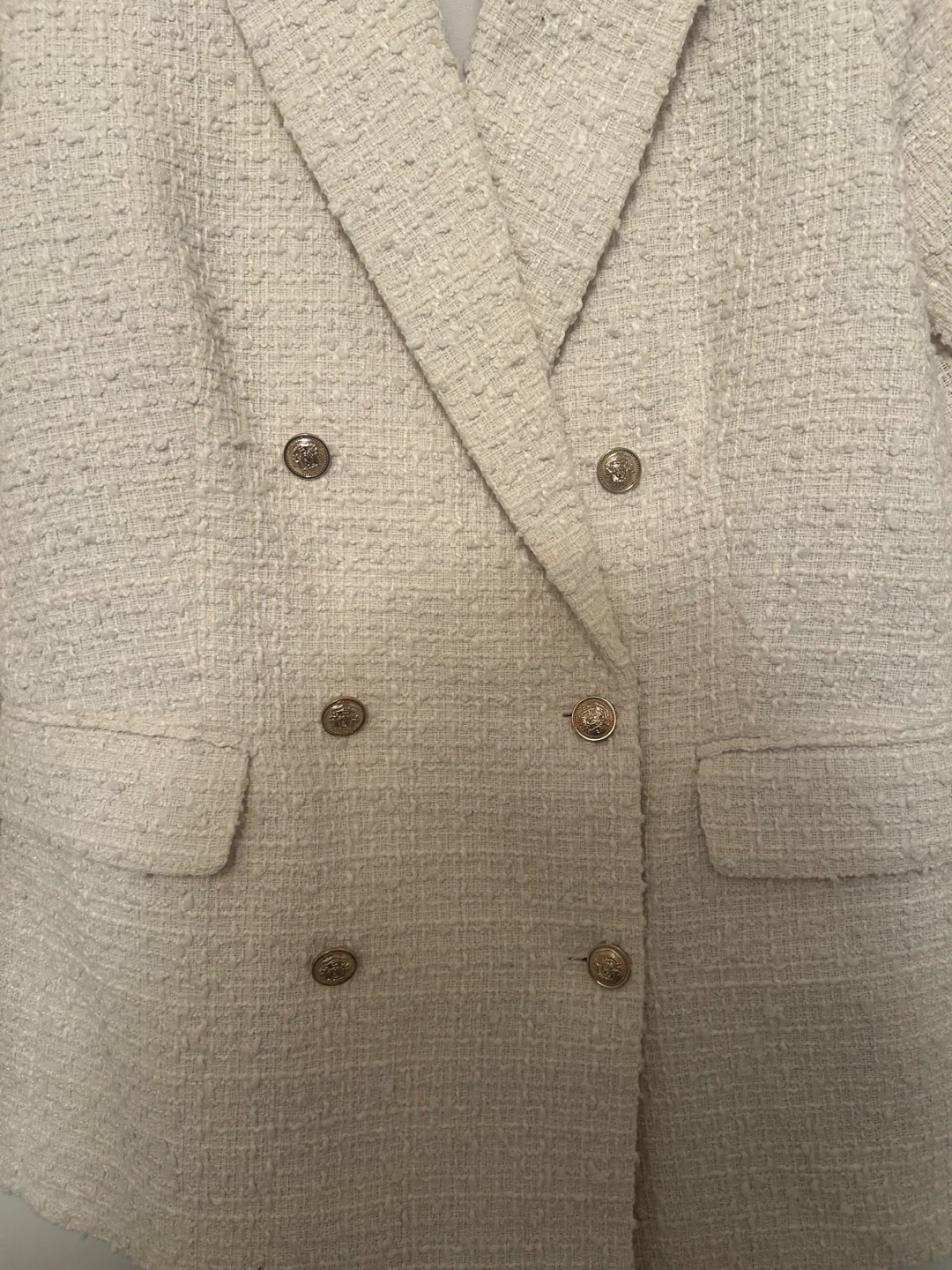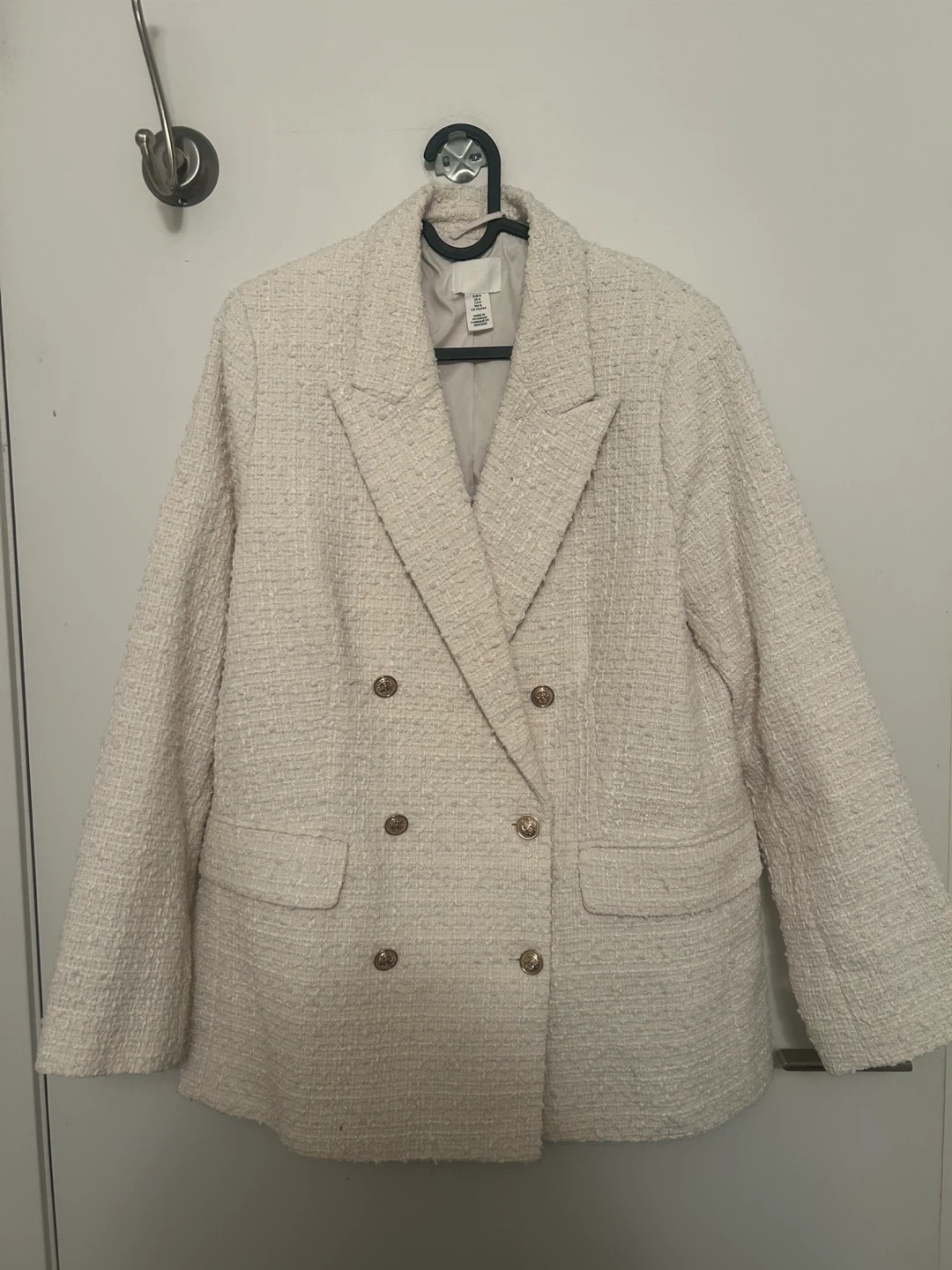 This is an H&M cream tweed blazer jacket. It's a double-breasted style with gold-toned buttons. Size is medium but it’s oversized. When worn photo on the last slide.