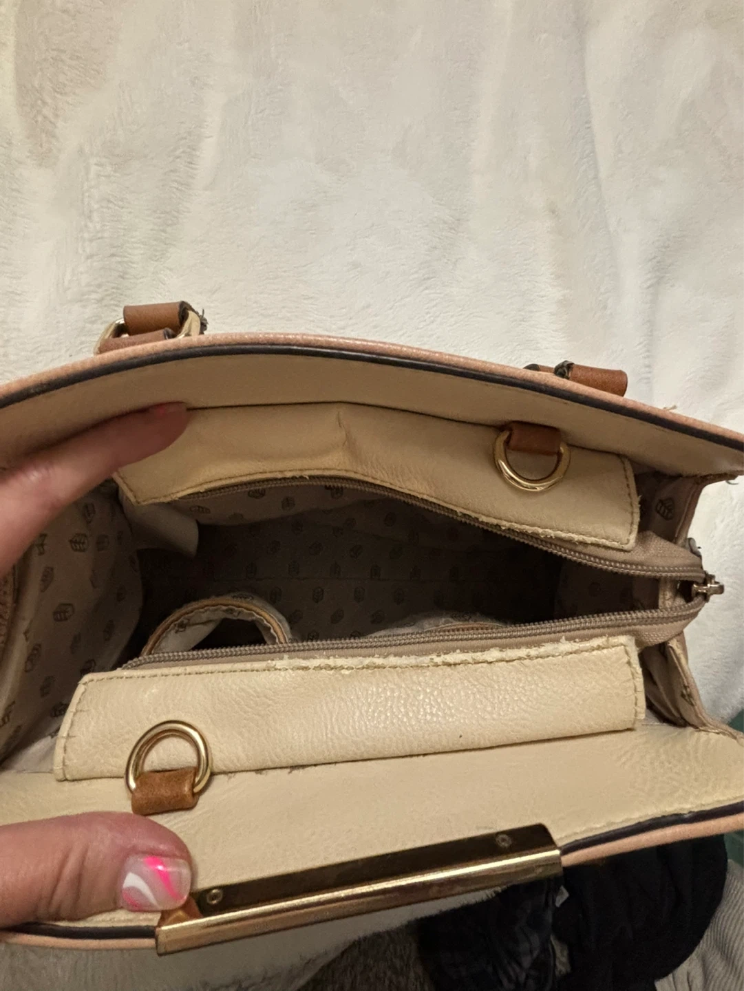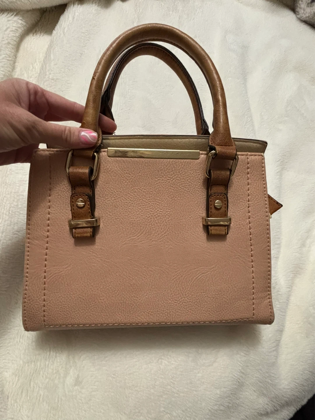 A pink faux leather handbag with brown top handles. It features a zip closure and an interior compartment. This bag is perfect for everyday use.