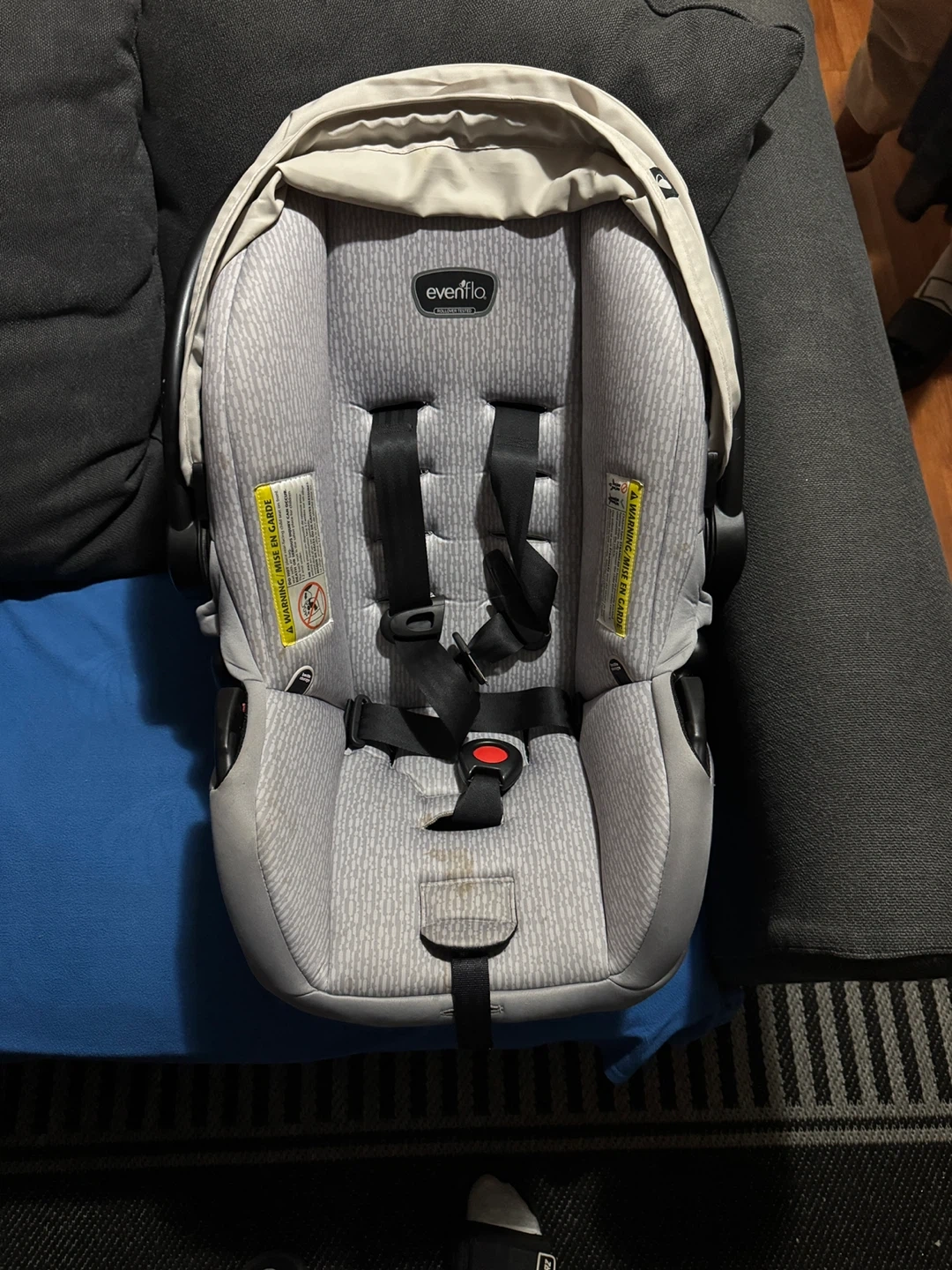 This Evenflo Litemax Sport infant car seat is grey and comes with a base. It was manufactured in 2022. This car seat is designed for infants and offers a secure way to transport them.