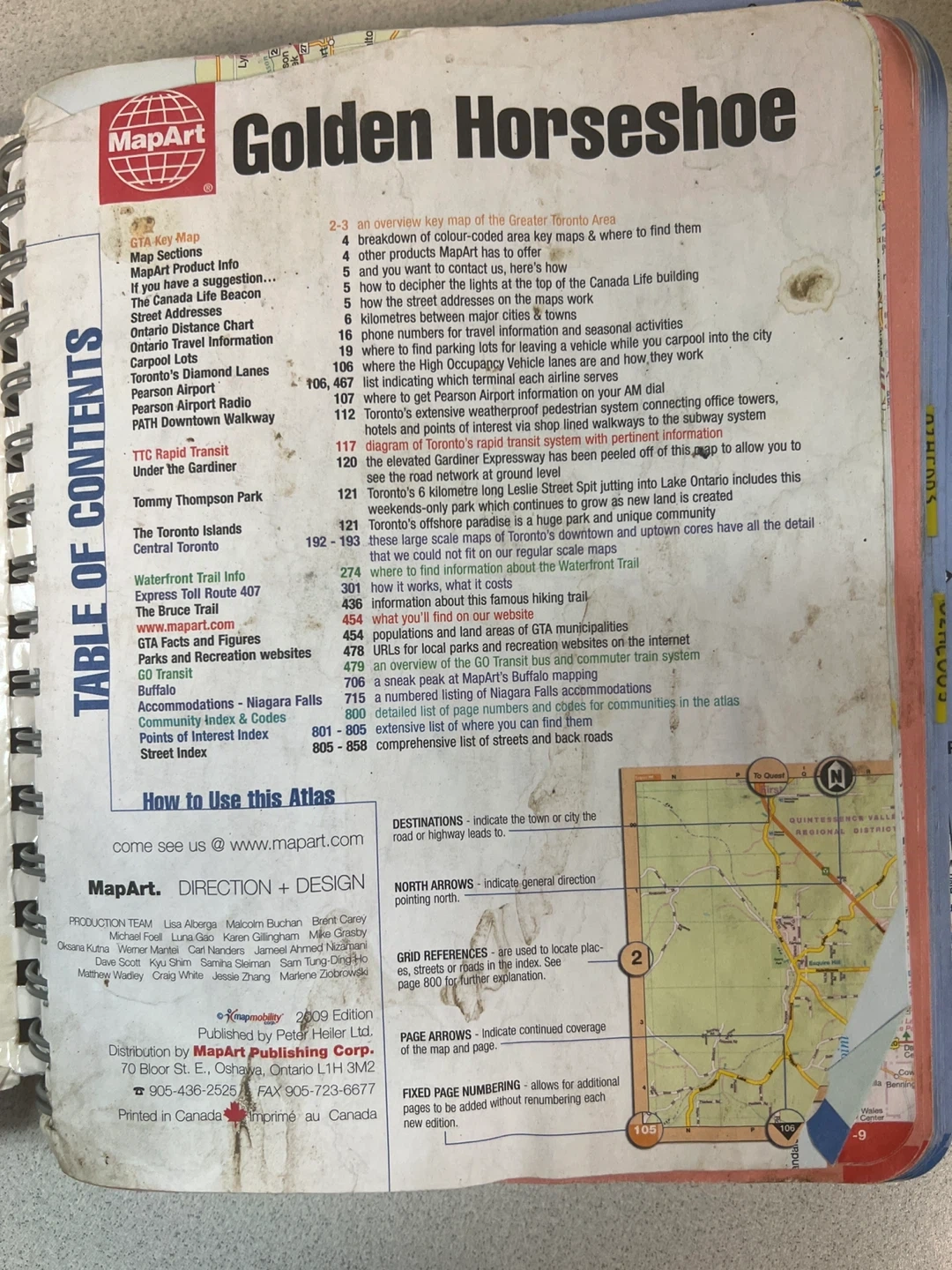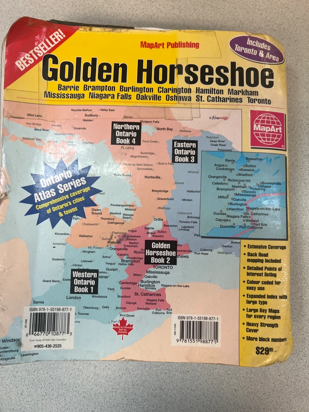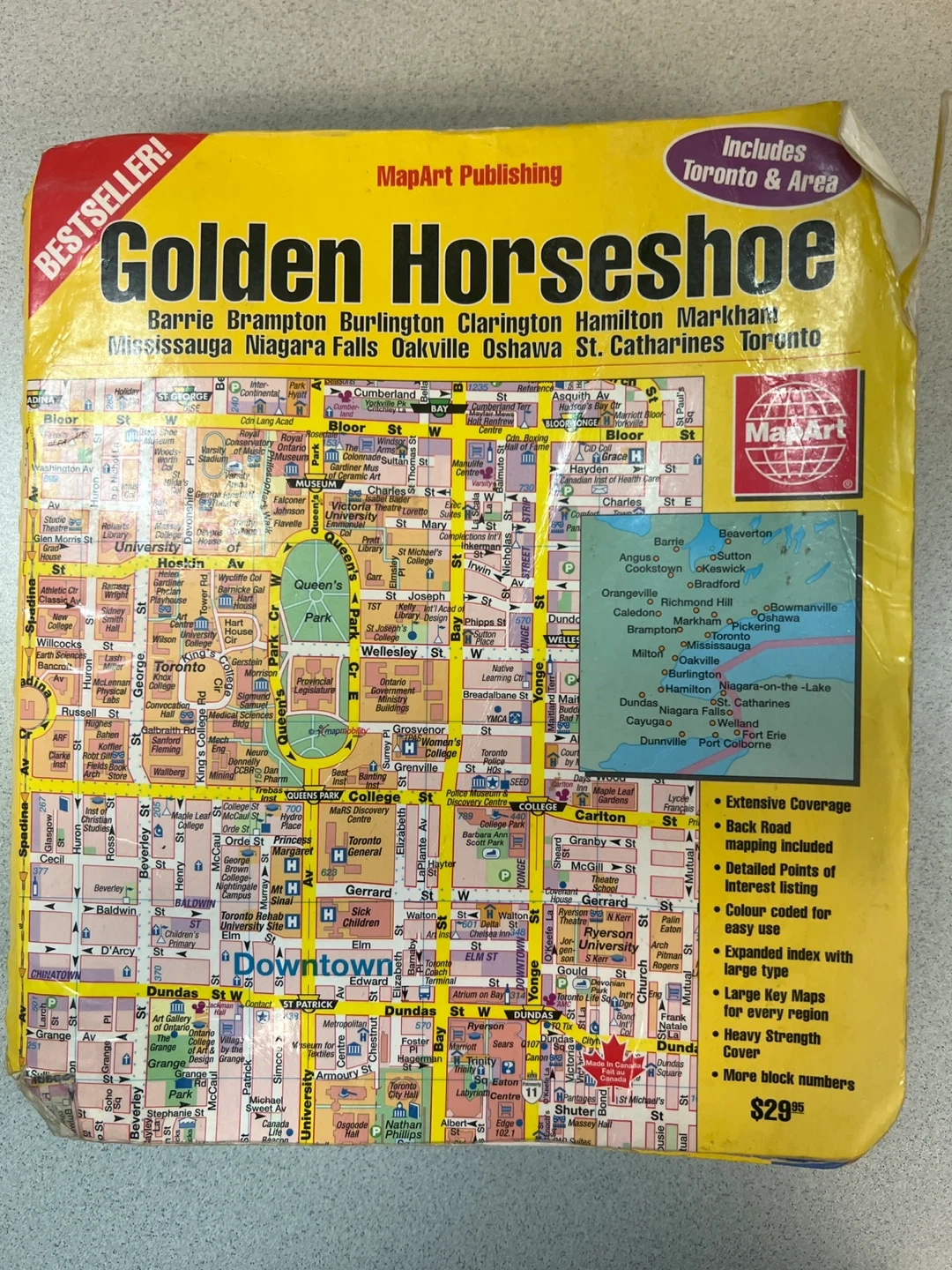 This MapArt Golden Horseshoe map covers Barrie, Brampton, Burlington, Clarington, Hamilton, Markham, Mississauga, Niagara Falls, Oakville, Oshawa, St. Catharines, and Toronto. It includes Toronto and area, extensive coverage, back road mapping, detailed points of interest, and colour-coded for easy use. It also features large key maps for every region.