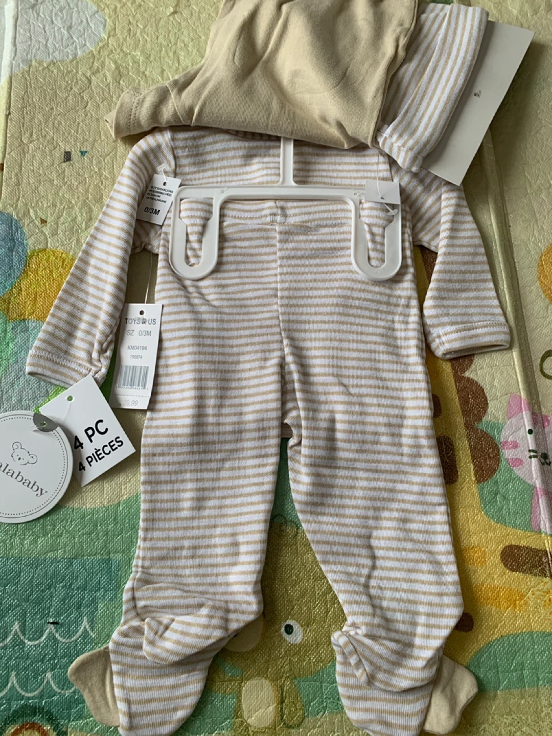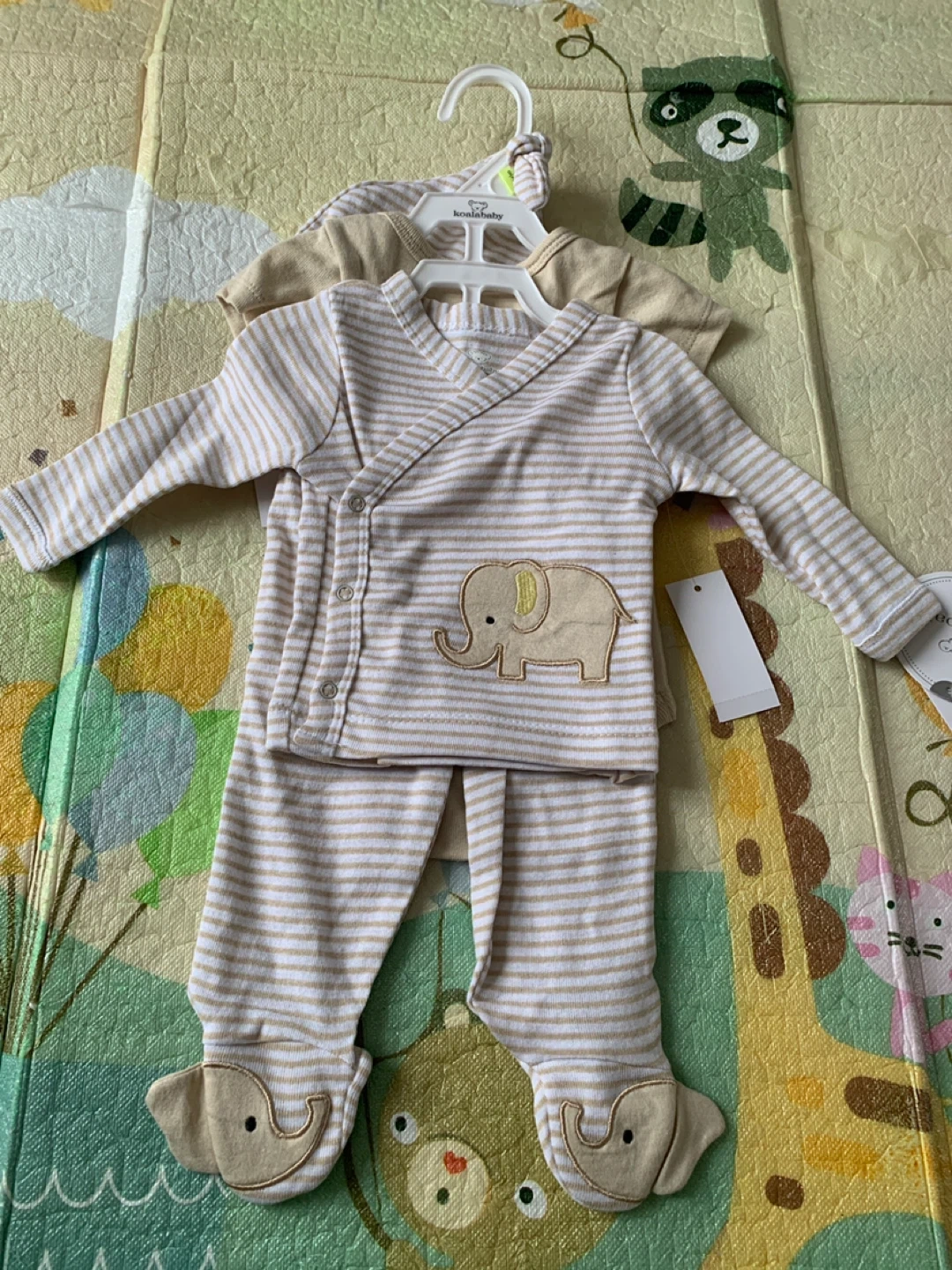 This 4-piece Koala Baby set includes a onesie, pants, a kimono top, and a hat. It's sized for 0-3 months. The outfit features a tan and white stripe pattern with cute elephant details and a "I'm New Here" graphic.