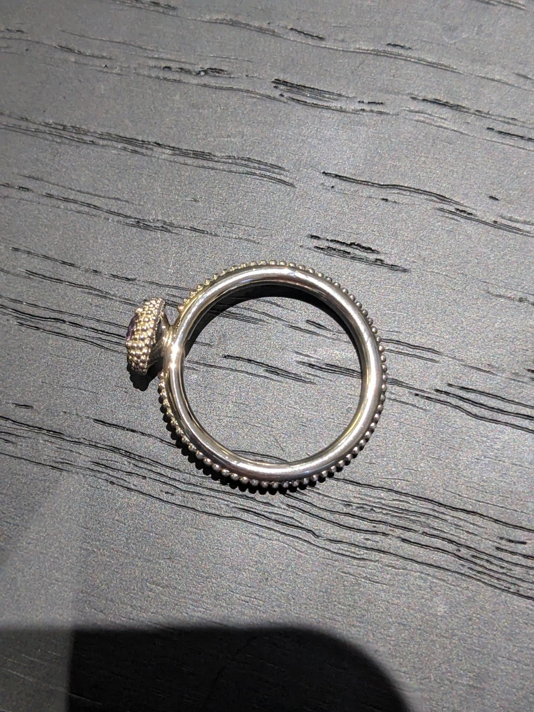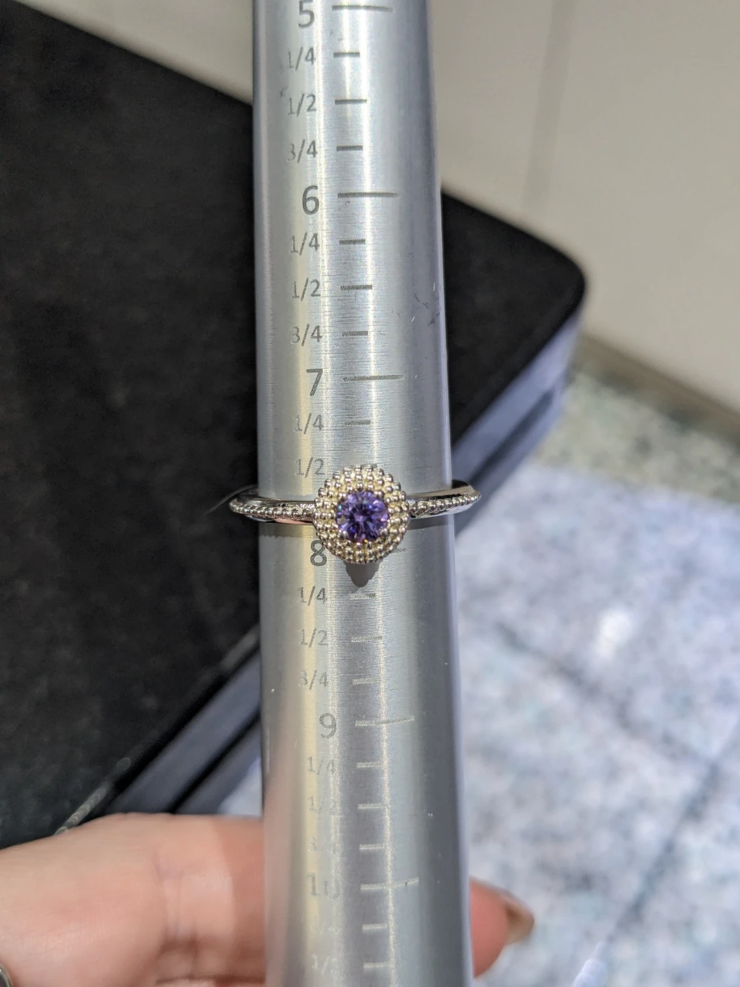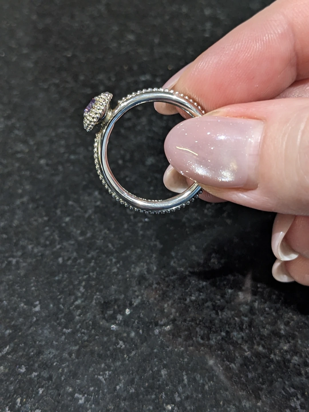 This is a never worn size 7.75 - 8 sterling silver Chamilia birthstone ring (amethyst/February). The brand Chamilia was a Swarovski brand before it was discontinued in 2019. Stamped 925 and with the CHAM brand stamp.