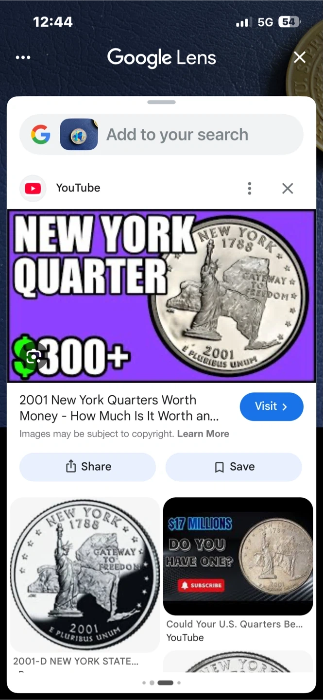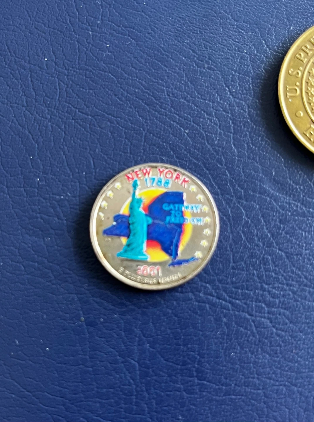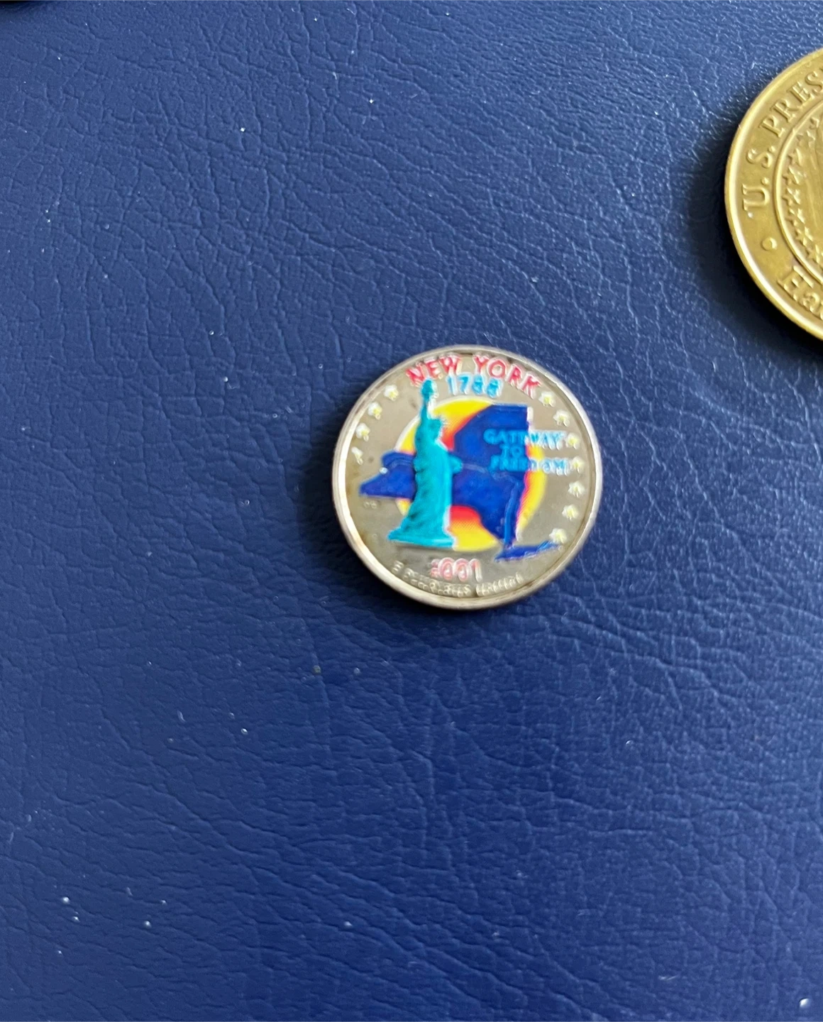 This is a 2001 New York State quarter dollar coin. It features the Statue of Liberty and the outline of New York State. The coin's reverse side is colourful. It's a standard quarter size.