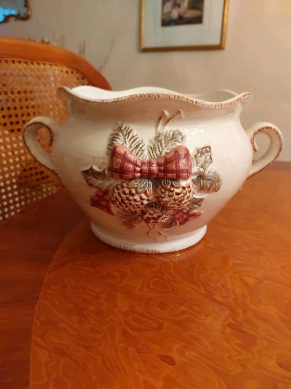 Two beautiful, big, matching bowls ...will look delightful and festive with pine branches, pomegranates, oranges, or whatever mood and atmosphere you desire or wish to create. Excellent condition Add-on ...Made in Canada "Northern Exposure Pewter" Two ornaments for your tree! PLUS three brass candlesticks and two glass candle holders. Great items- great deal!