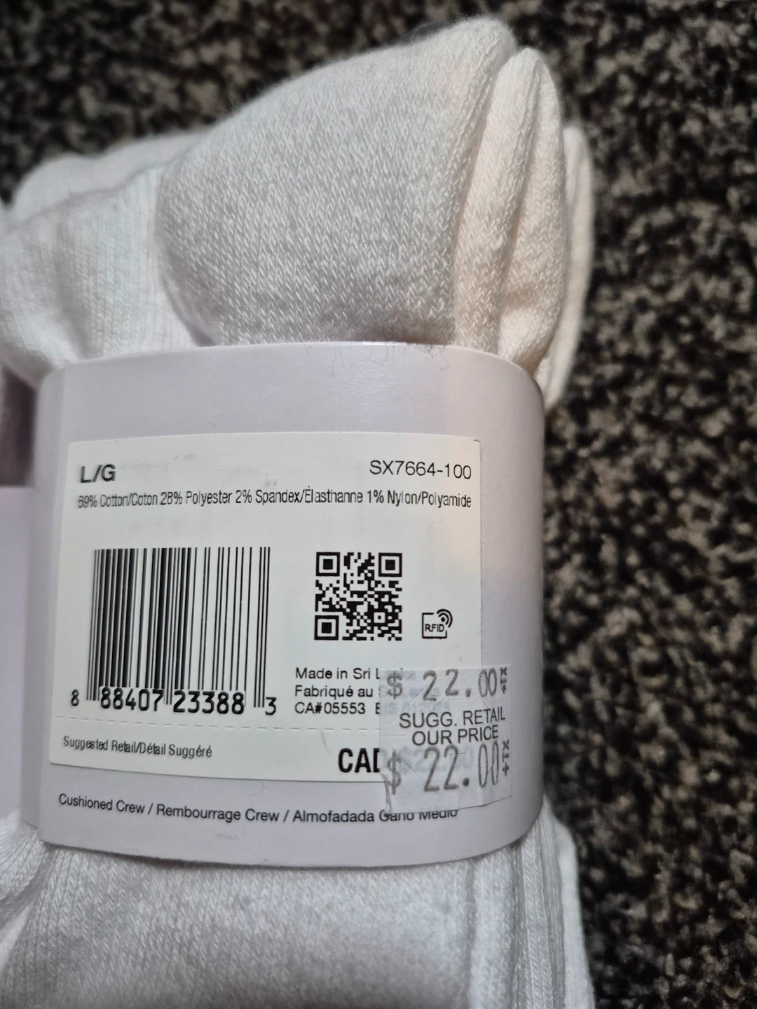 Selling a 2 sets of 3 Nike Everyday Cotton Cushioned Crew socks in size L/G. They are white and made with Dri-FIT technology. The material is 69% cotton, 28% polyester, 2% spandex/elastane, and 1% nylon/polyamide. Originally retailed for $22 dollars each or 44 for both! Both are brand new and in good condition! Selling each for 18 dollars or 30 dollars for both!