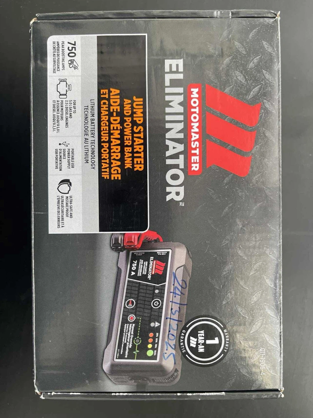 This Motomaster Eliminator 750A jump starter and power bank is designed for lithium battery technology. It's portable and includes USB ports for charging devices.