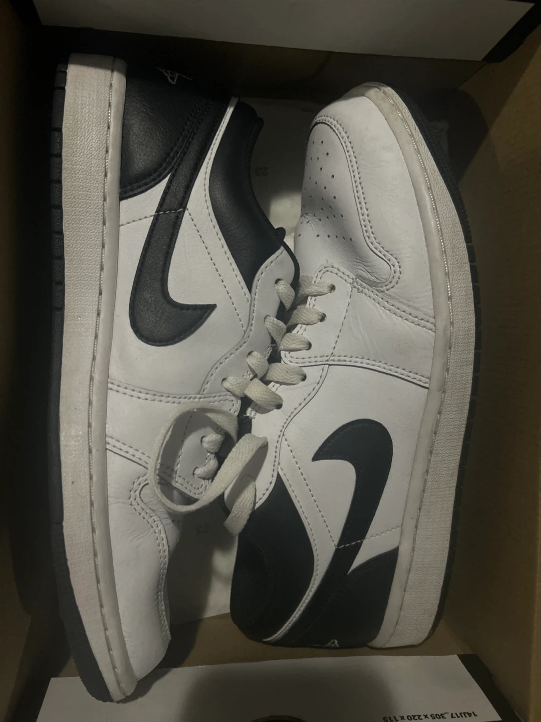 Selling a pair of Air Jordan 1 Low sneakers in white and black, size 9. They come with the original box