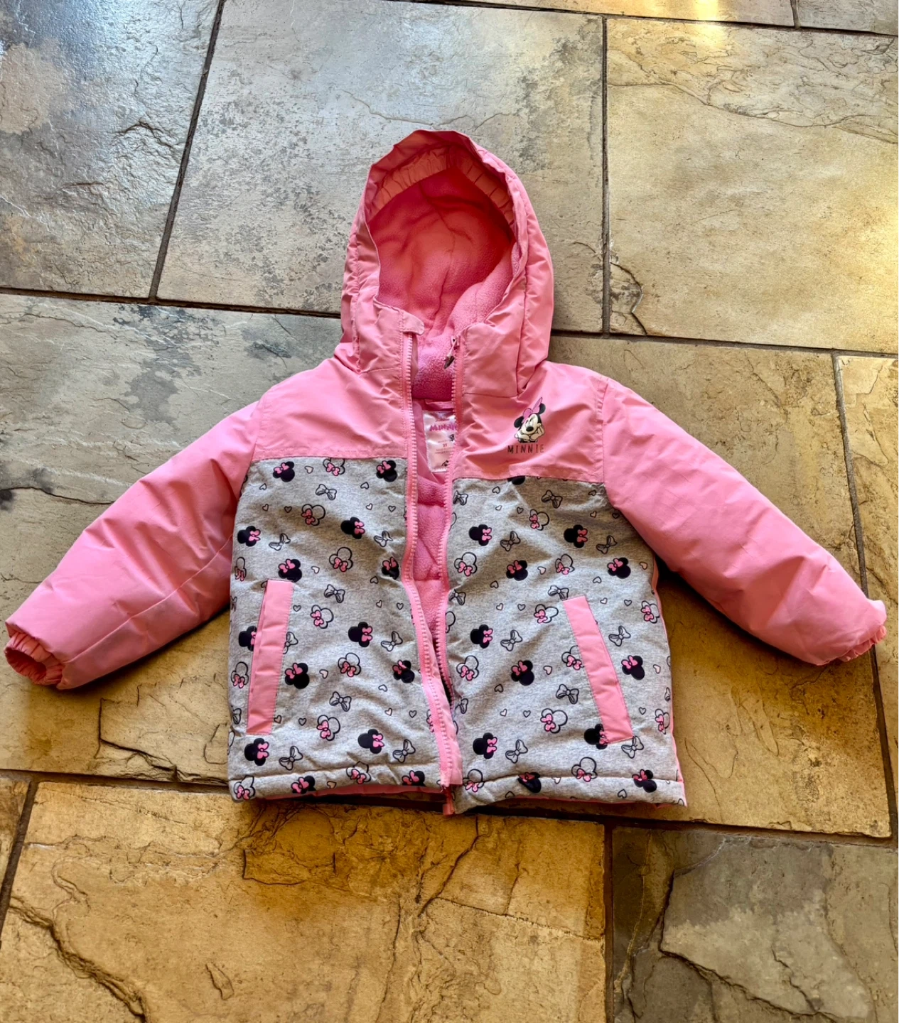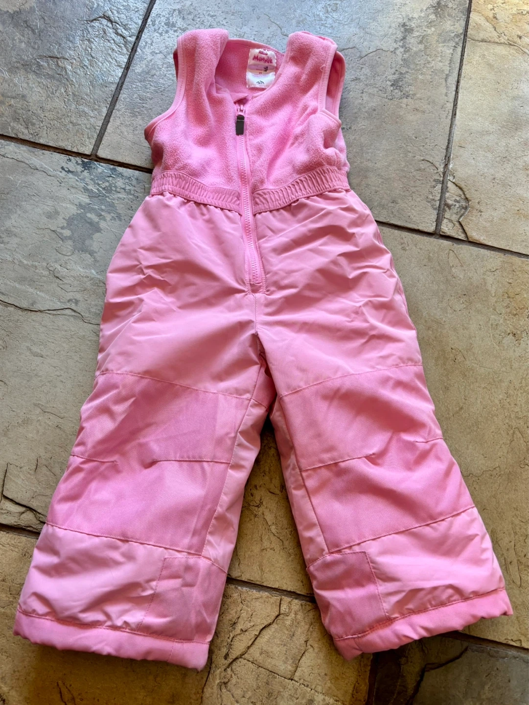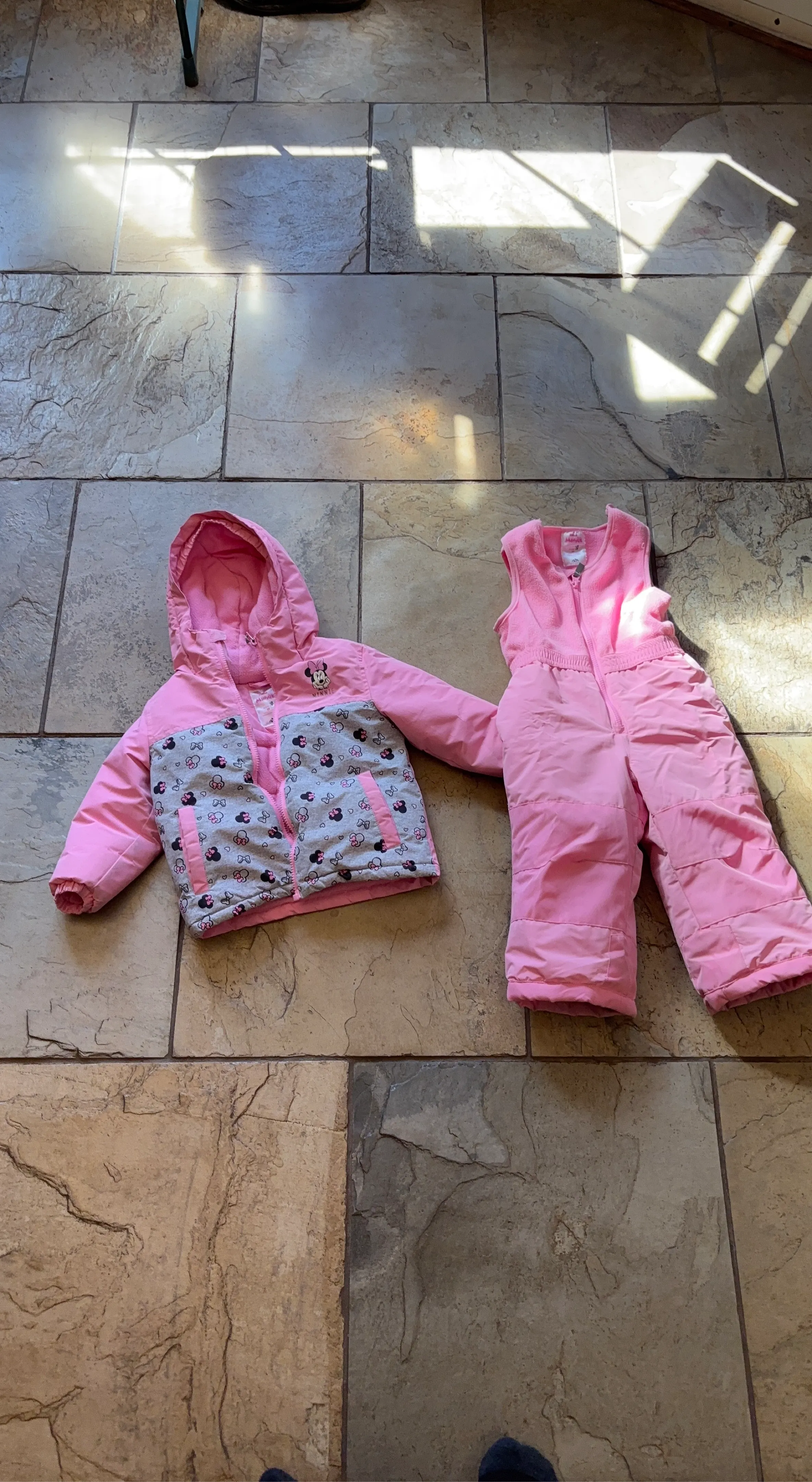 This cute Minnie Mouse ski suit set includes a pink hooded jacket and matching snow pants. It's perfect for keeping your little one warm and dry during winter adventures. The jacket features a playful Minnie Mouse pattern and the pants are a solid bright pink. 2T