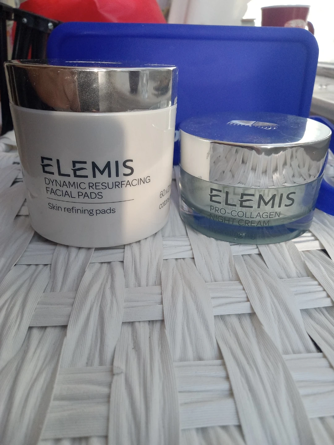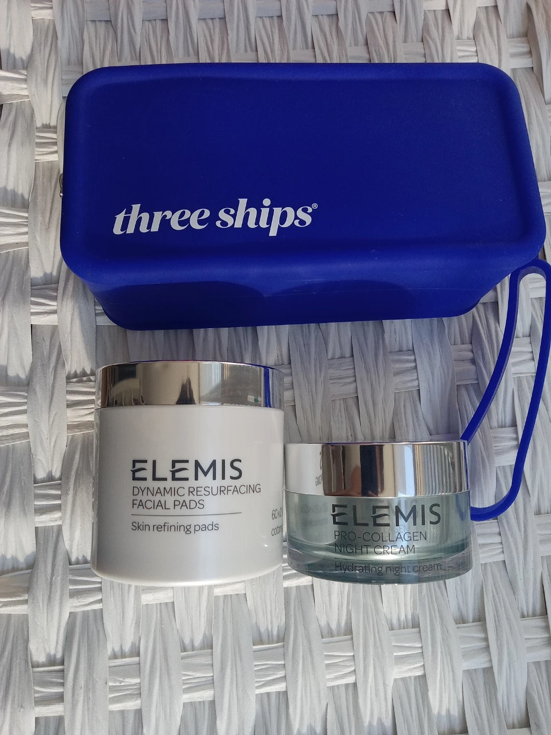 This set includes Elemis Dynamic Resurfacing Facial Pads and Elemis Pro-Collagen Night Cream. It also comes with a blue Three Ships silicon travel case.
