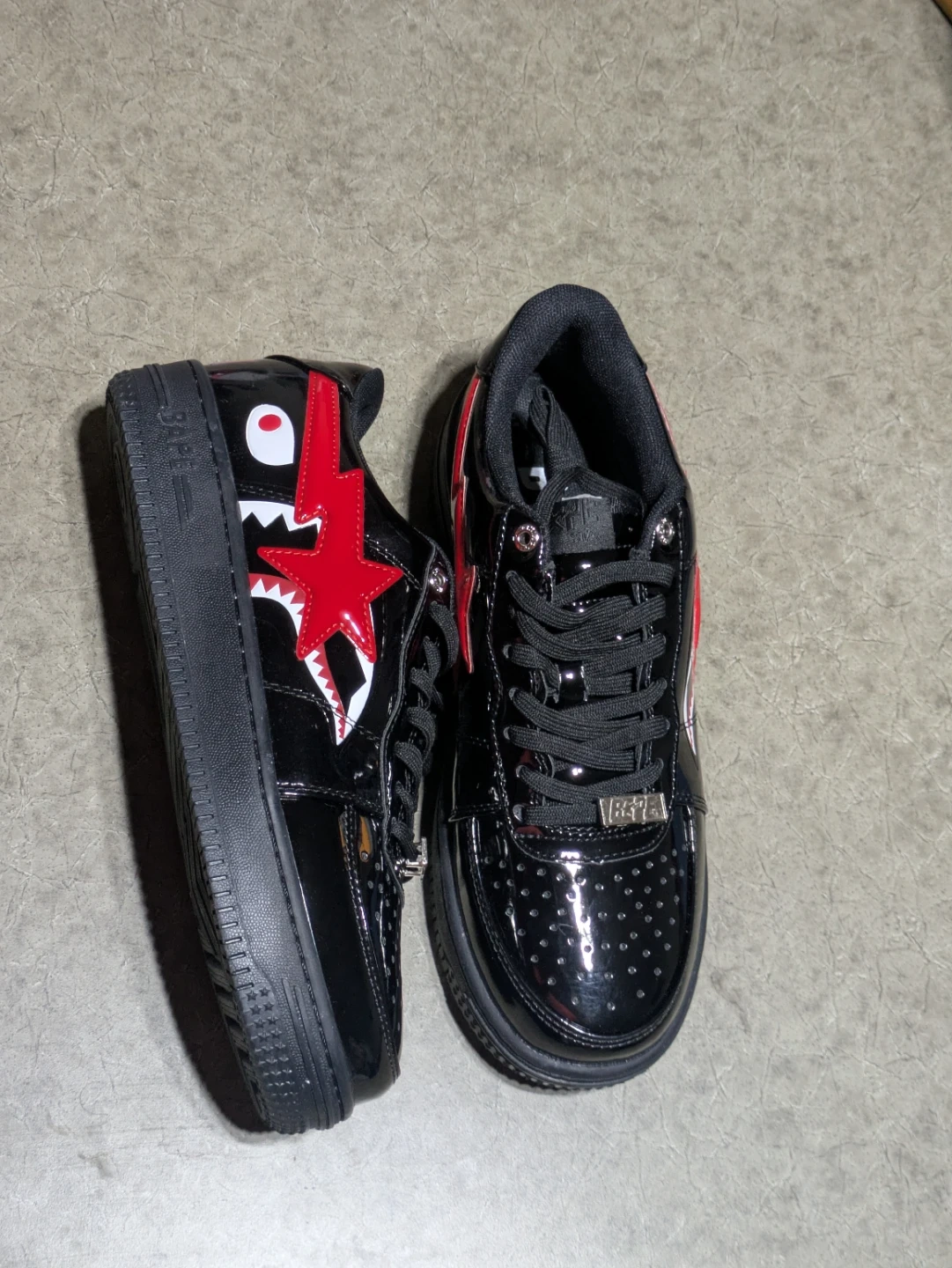 Black patent leather A Bathing Ape BAPE STA sneakers with red and white shark graphics. Men's US size 9.5, which is 27.5 cm.
