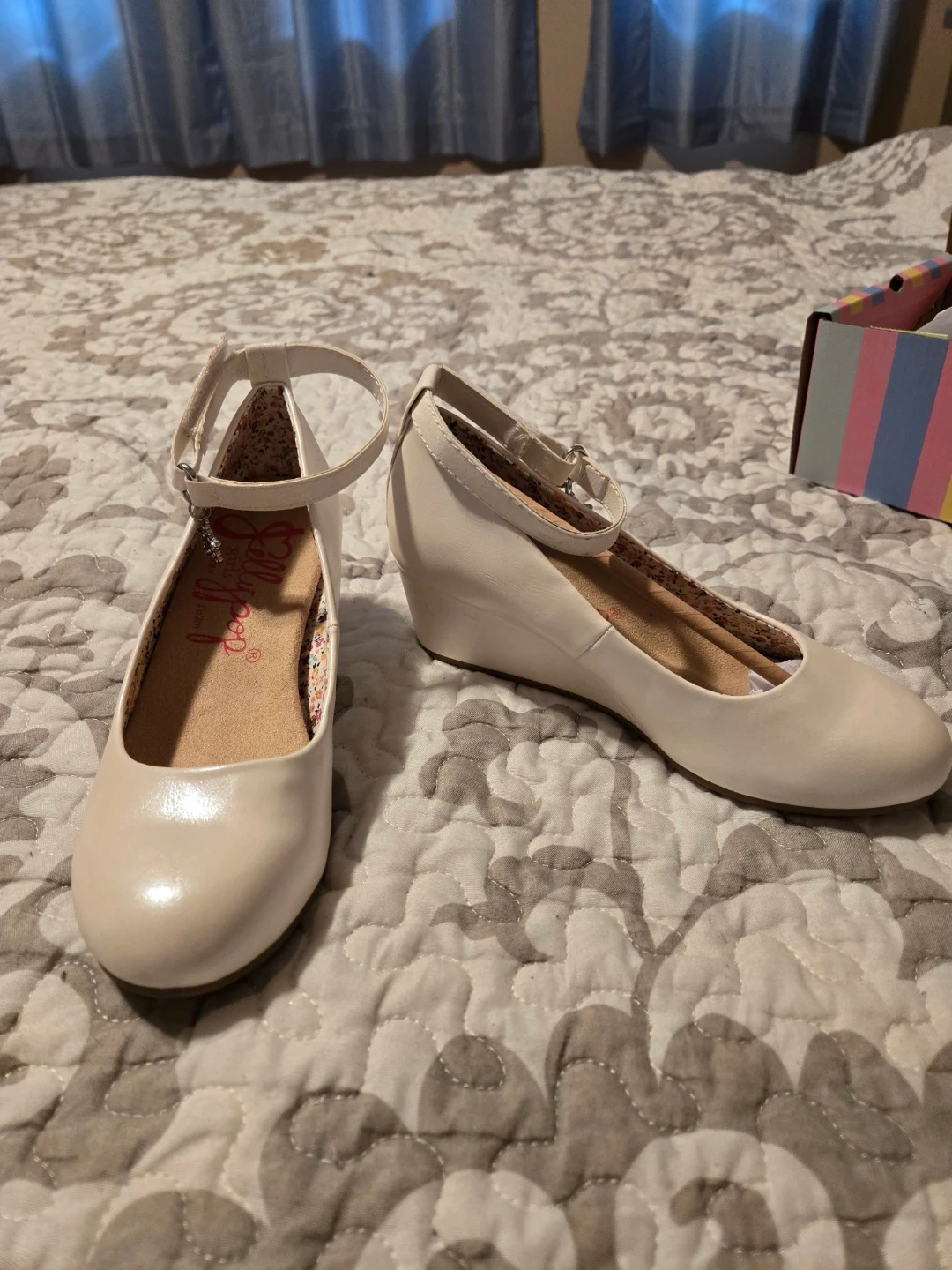 These white wedge shoes feature a convenient ankle strap with a buckle closure. They have a classic round toe and a comfortable insole with a floral lining. A lovely addition for dressy occasions!