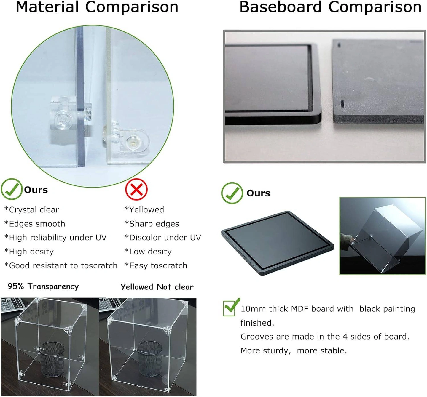 This clear acrylic display case is perfect for showcasing your collectibles or figurines! It comes with a black base and is designed to be crystal clear, with smooth edges and high reliability under UV light. It's also good resistant to toscratch, ensuring your items stay protected while on display.
