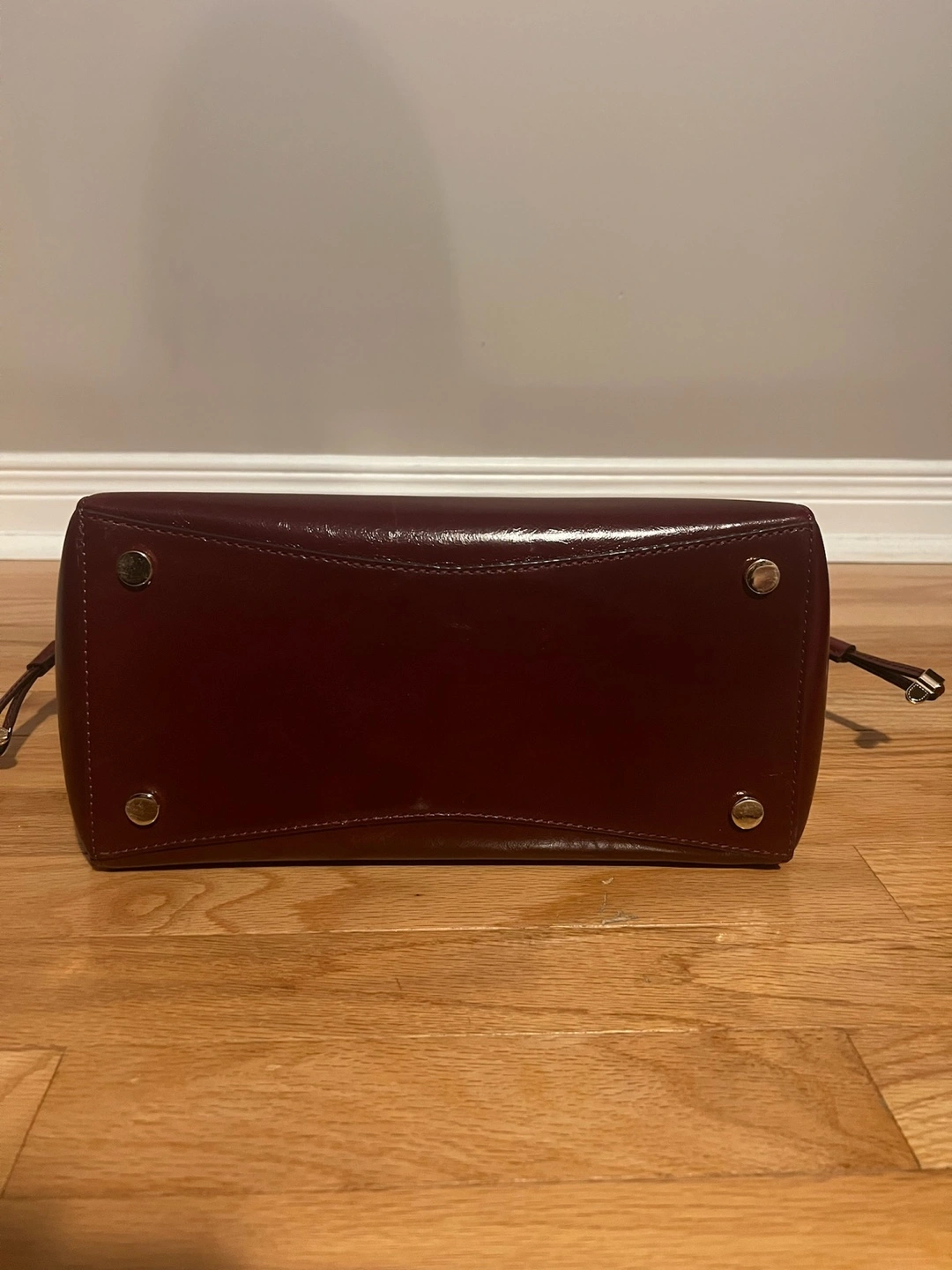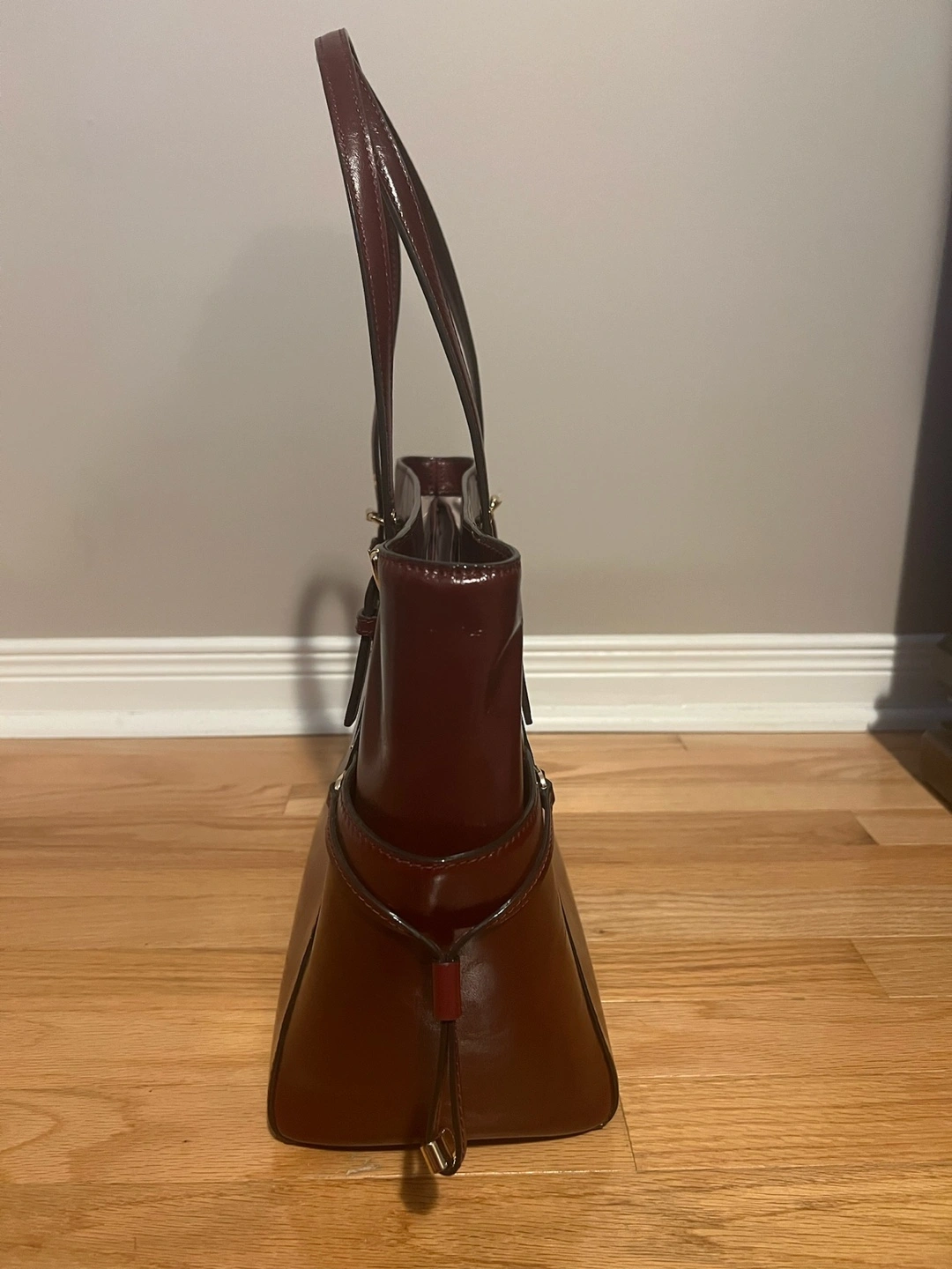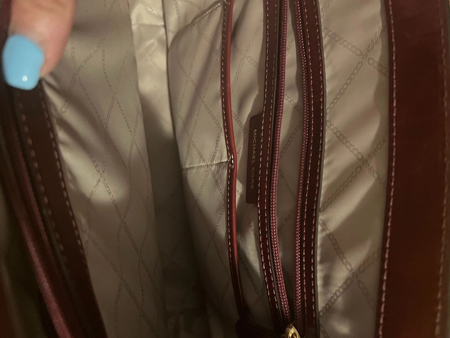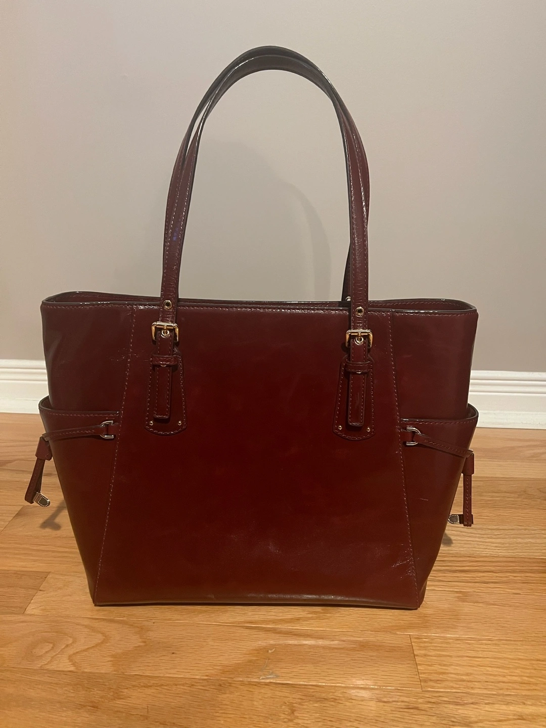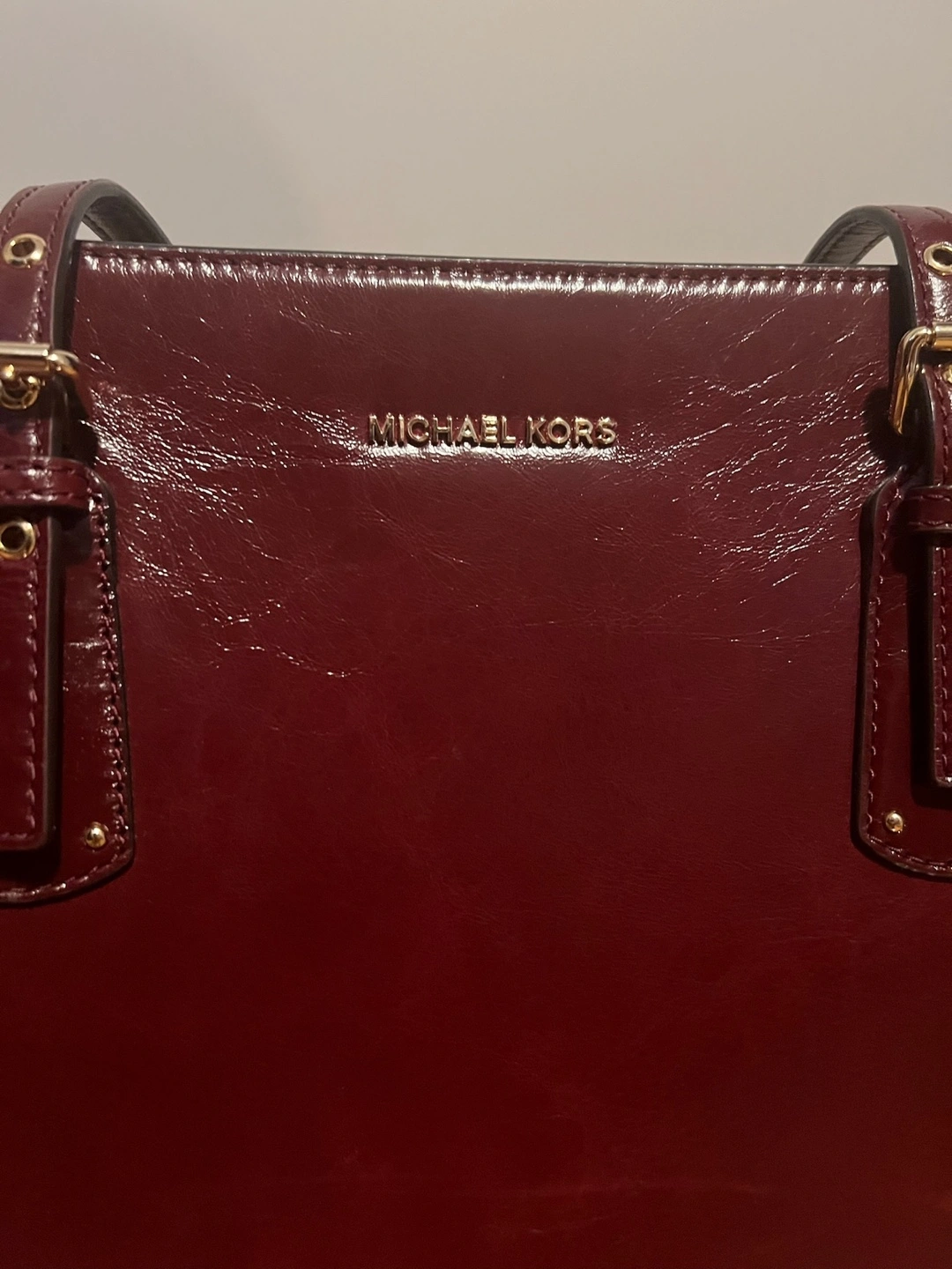 Michael Kors glossy Leather Tote Bag in a rich burgundy colour. Multiple pockets inside including a sleeve for a small laptop in the centre.
