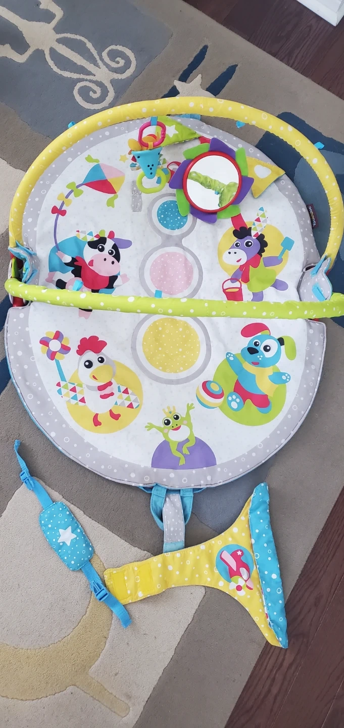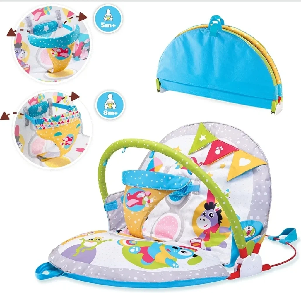 This colourful play mat features an overhead arch. It's designed for babies 0 months and up, offering a soft and engaging space for tummy time and play. The mat also includes a portable seat for early sitting stages.