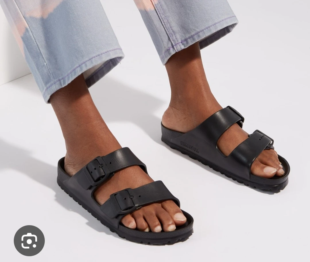 Black Birkenstock Arizona Essentials EVA sandals. These are a size 39, equivalent to 250mm. They're made from EVA material and feature adjustable straps.