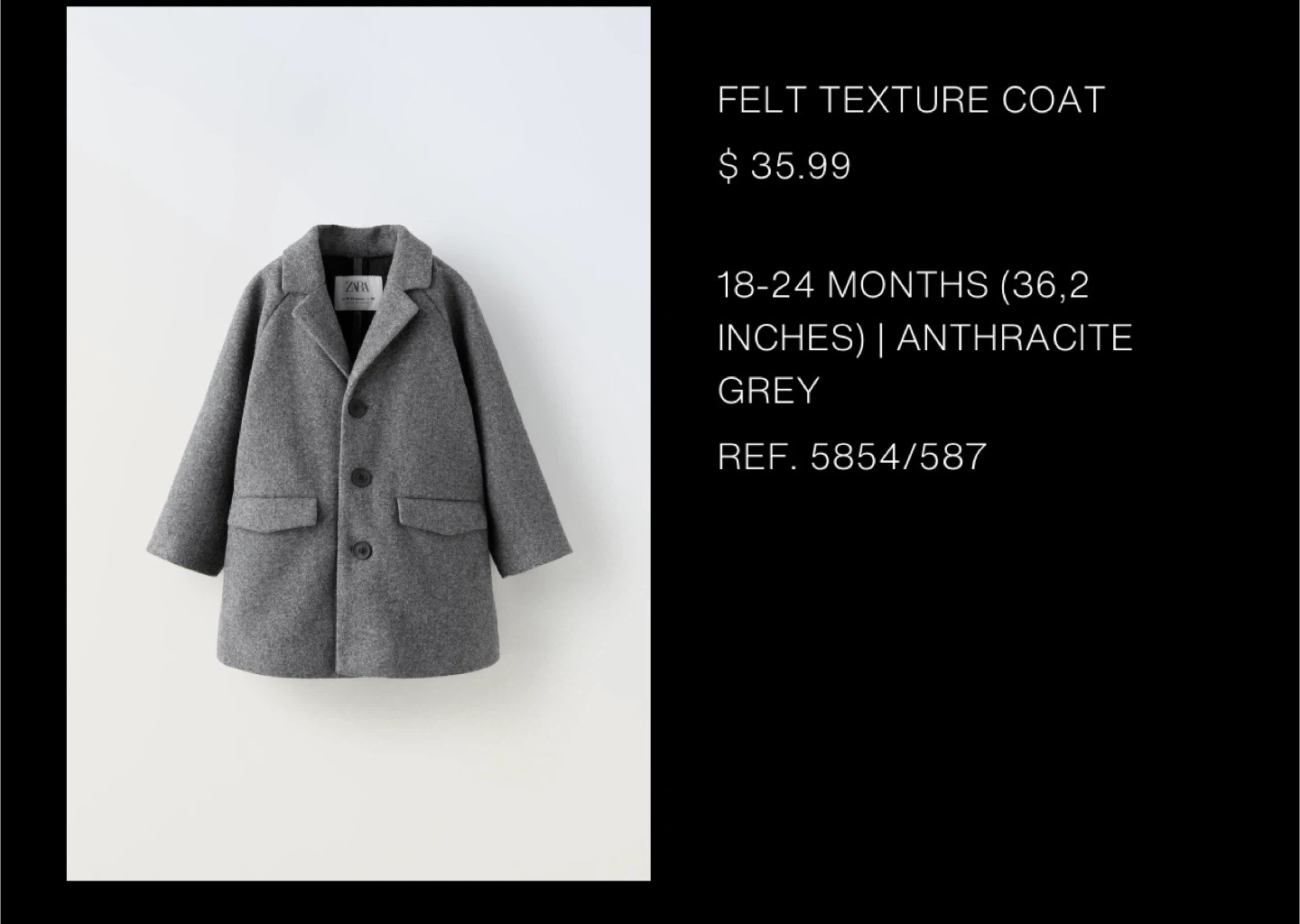 Never used - Toddler - Zara felt texture coat in anthracite grey, perfect for your little one! Size is 18-24 months (36.2 inches). Originally bought for $35.99