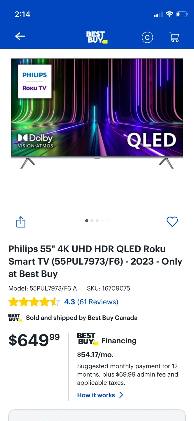 Selling a brand new Philips 55" 4K UHD HDR QLED Roku Smart TV!