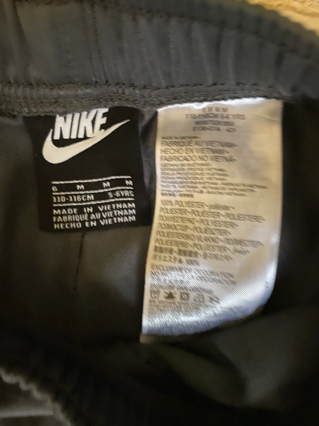 This is a kids' Nike tracksuit set in dark grey. It includes a zip-up jacket and matching pants. Both pieces are made from 100% polyester. The jacket has pockets and the pants have an elastic waistband. Perfect for active kids!