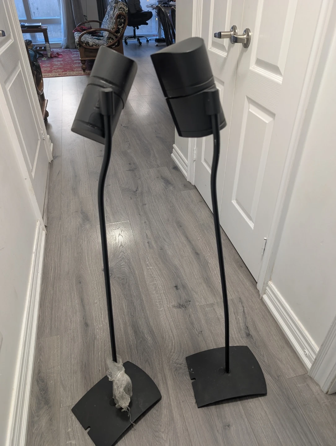 A pair of black Bose speaker stands. These stands are designed to elevate your speakers for optimal sound placement. They're made of metal and have a sturdy base for stability.
