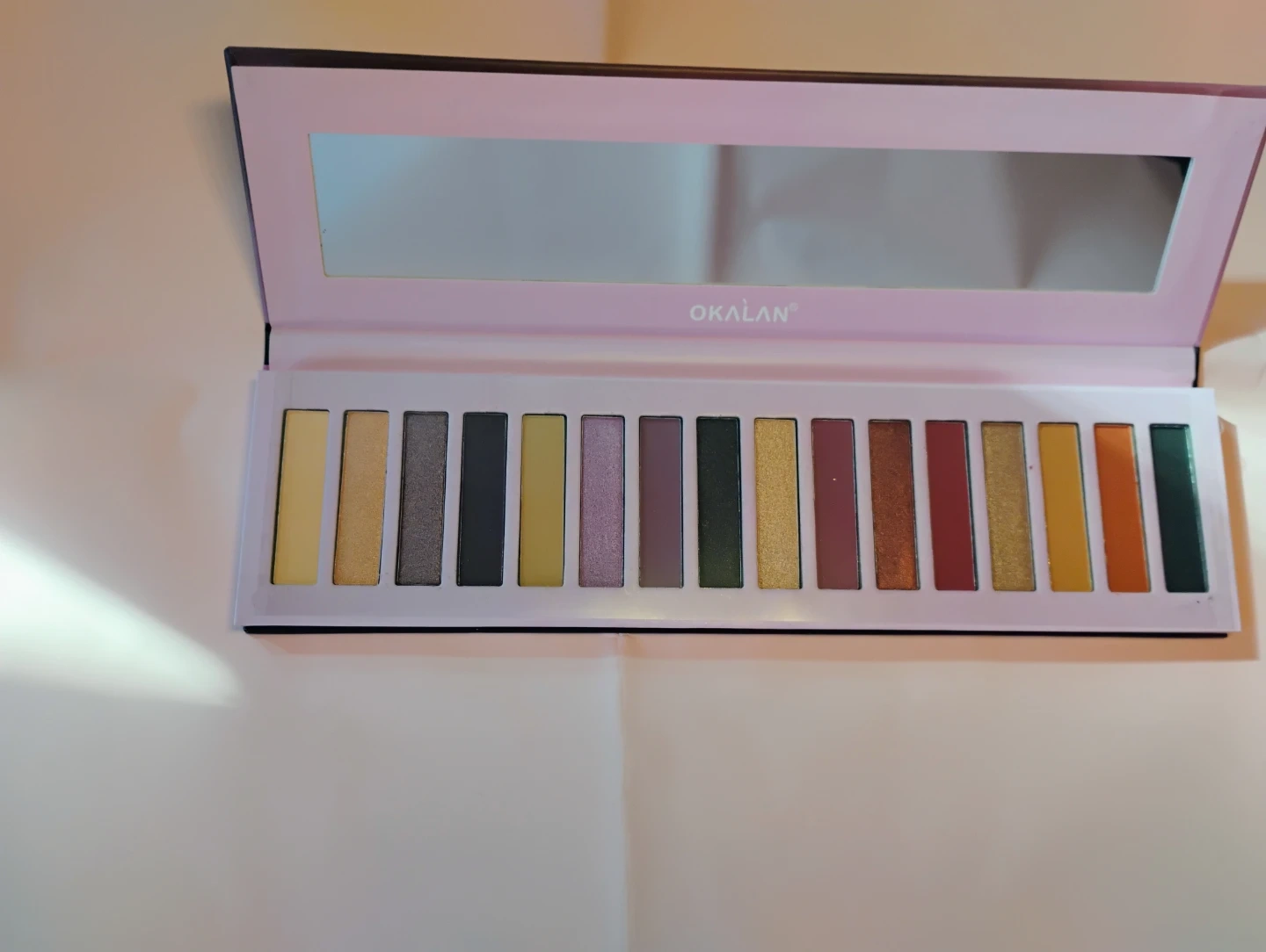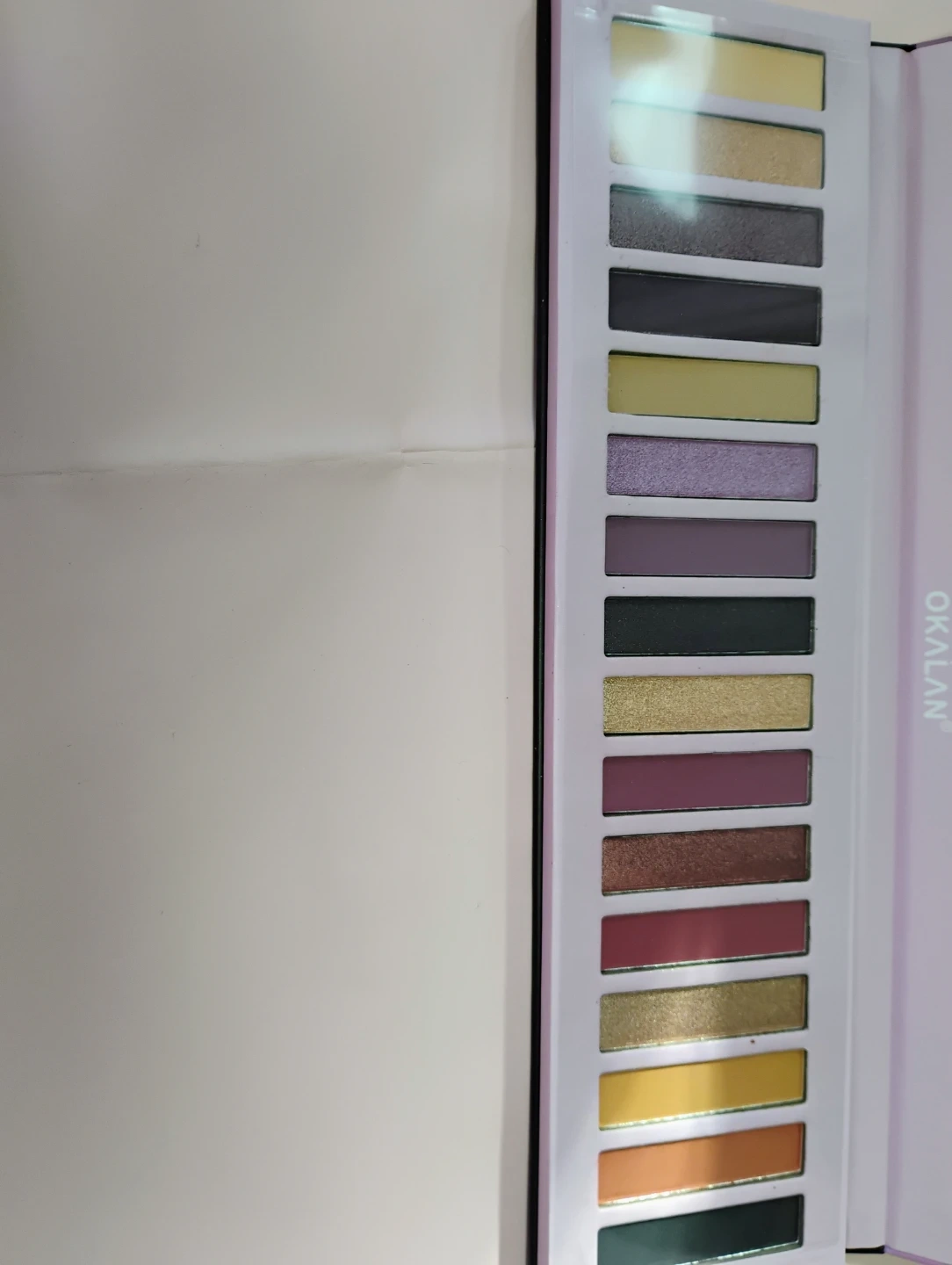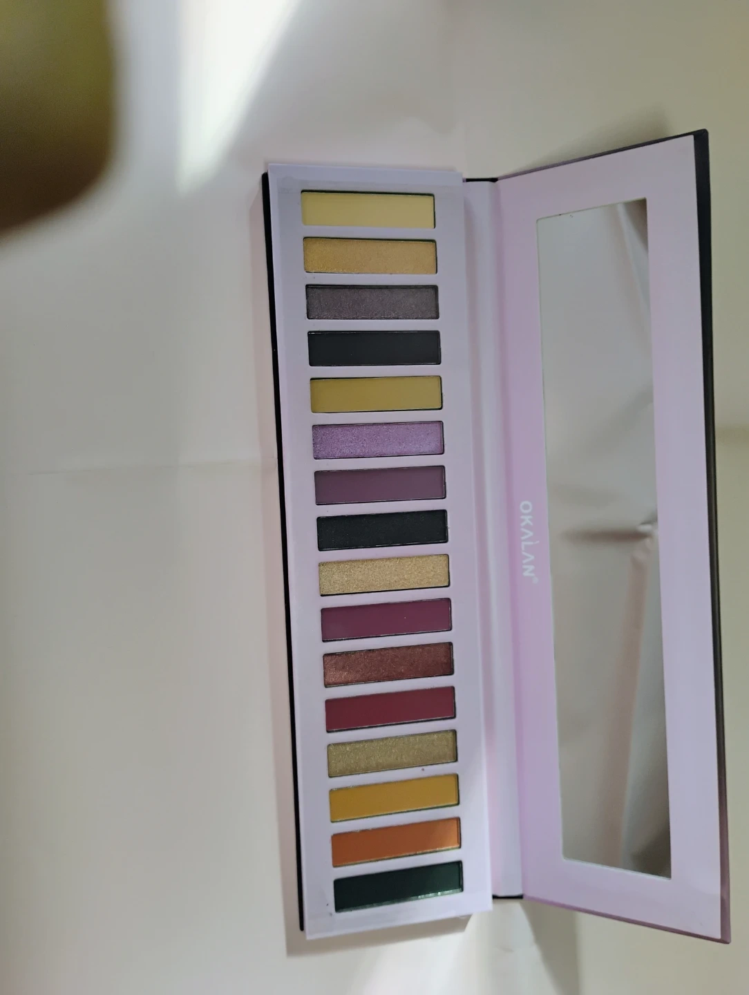 This O.Kalan eyeshadow palette features 18 shades, including mattes and shimmers. It comes with a built-in mirror. Palette dimensions are approximately 9" x 6.5".