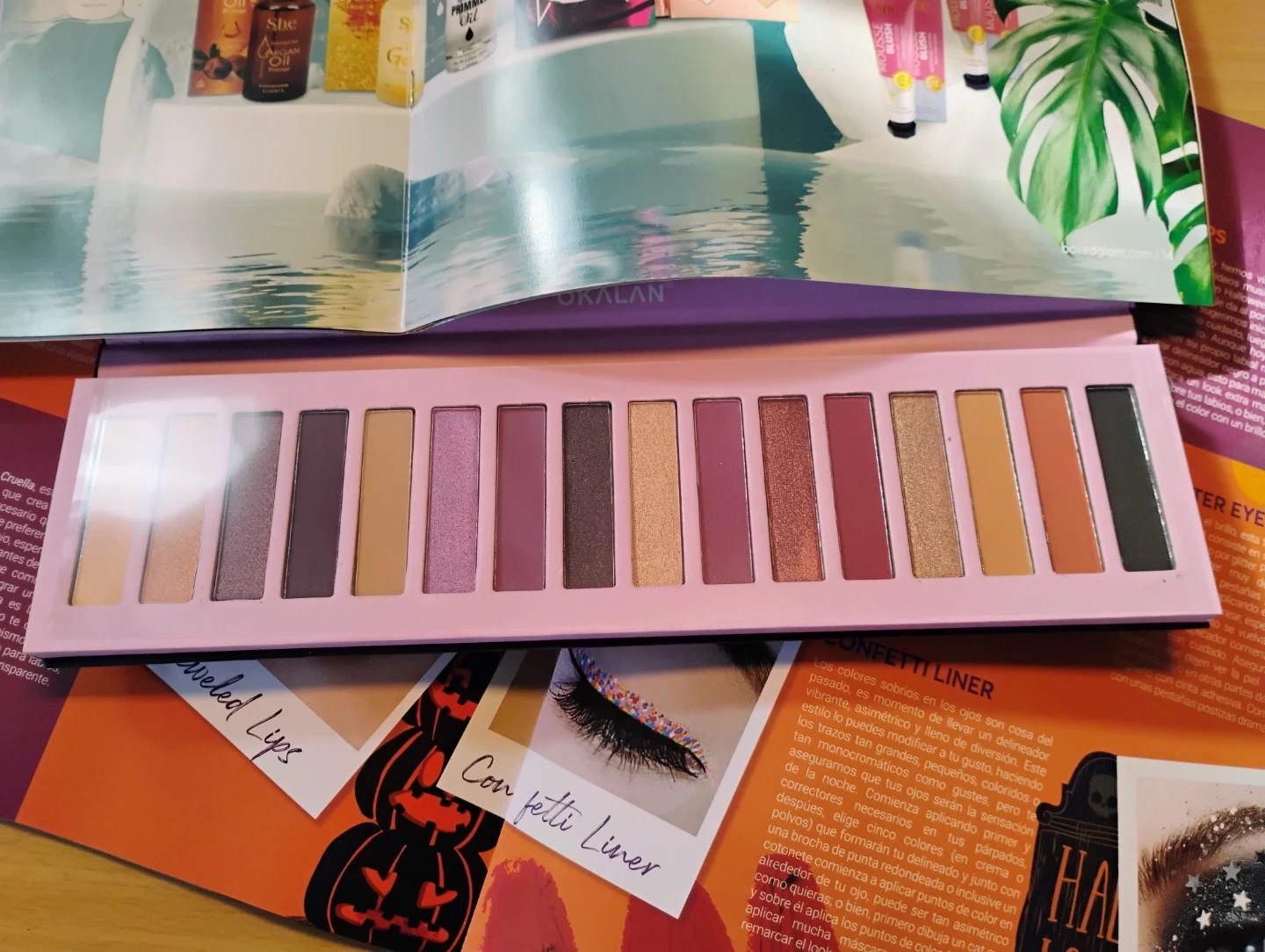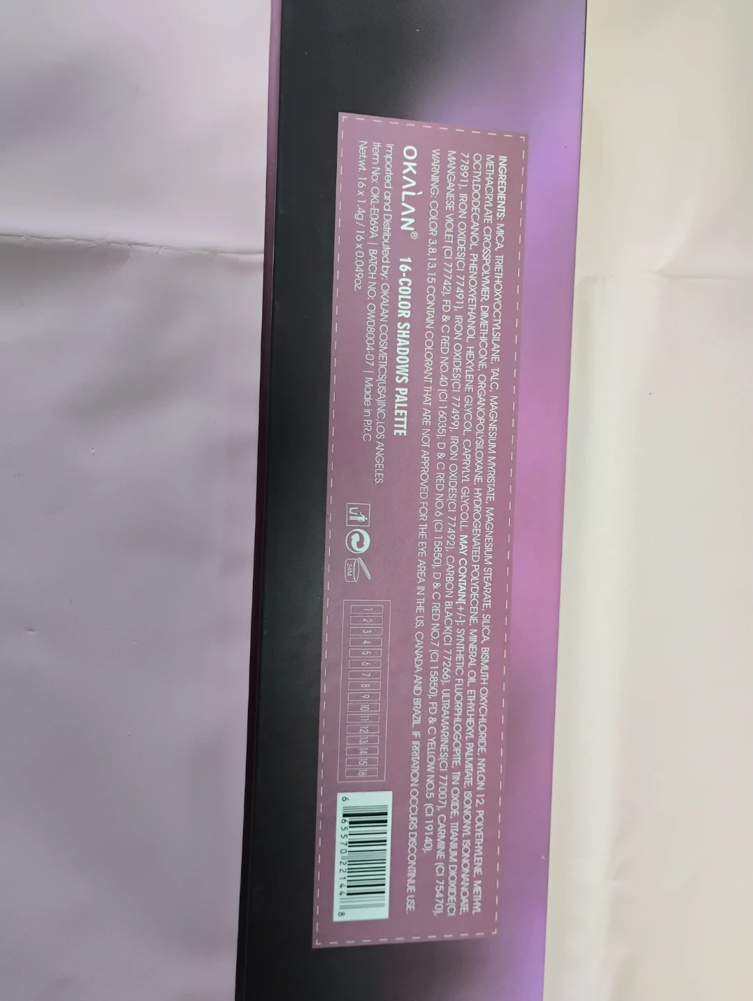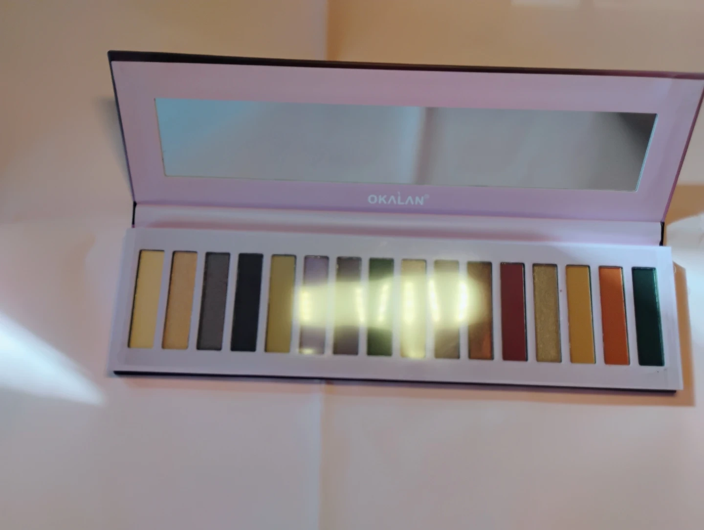 This O.Kalan eyeshadow palette features 18 shades, including mattes and shimmers. It comes with a built-in mirror. Palette dimensions are approximately 9" x 6.5".
