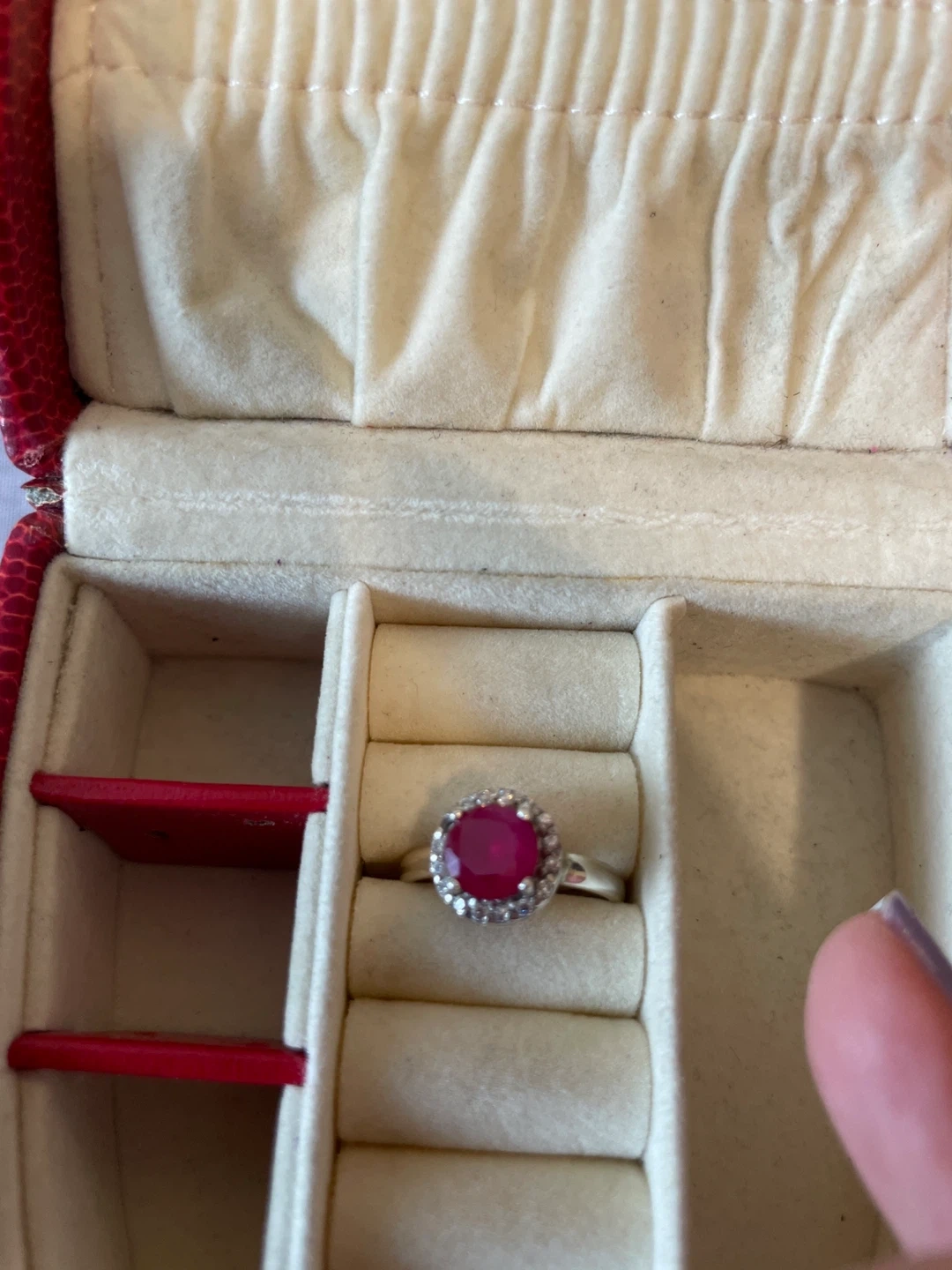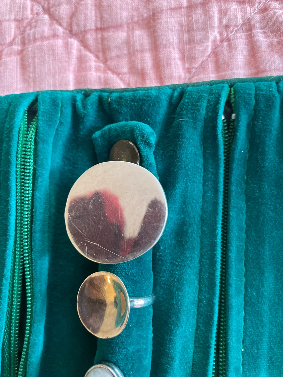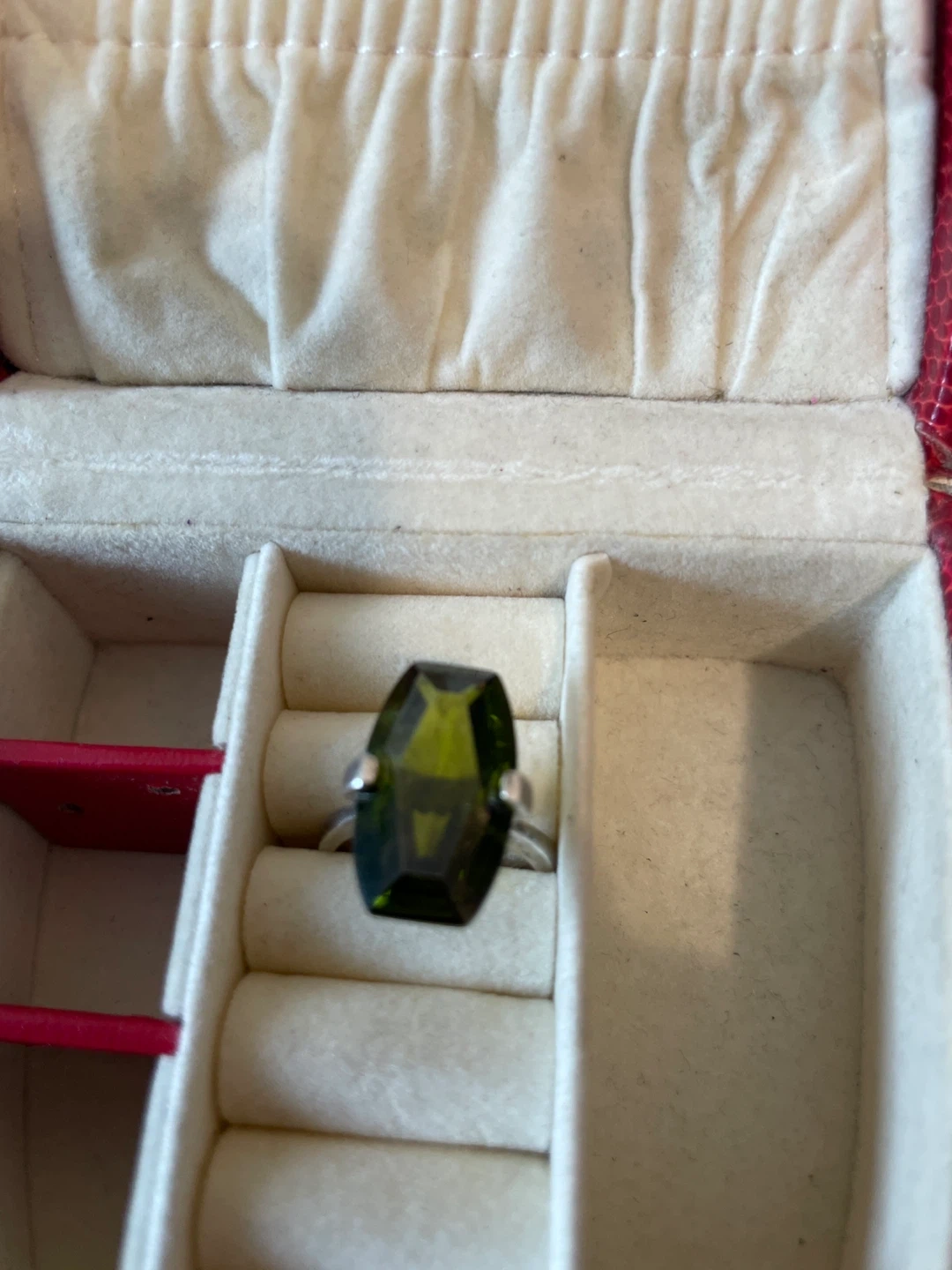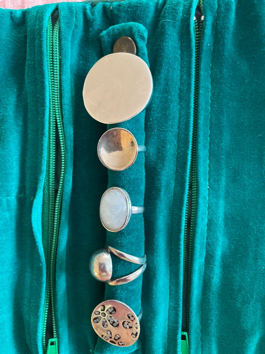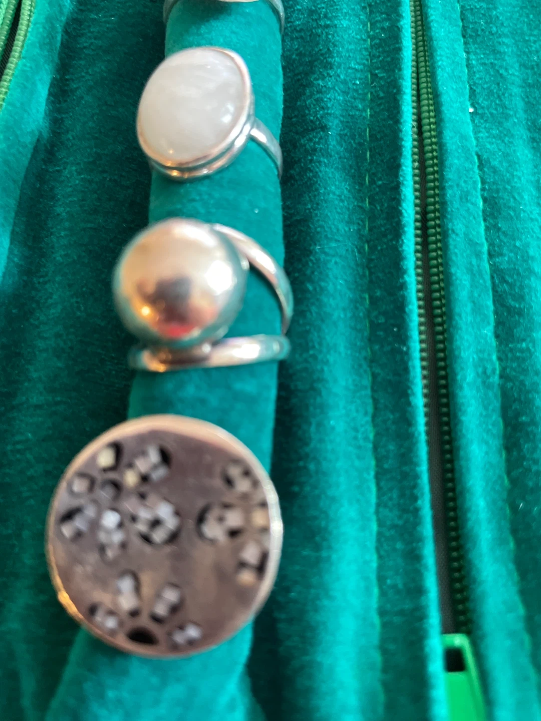 Five unique rings, some with polished stones and others with intricate designs. They're all silver, see 5.5-6.
