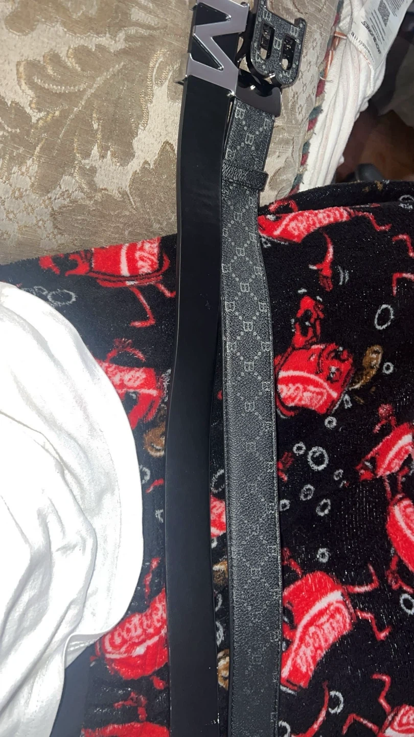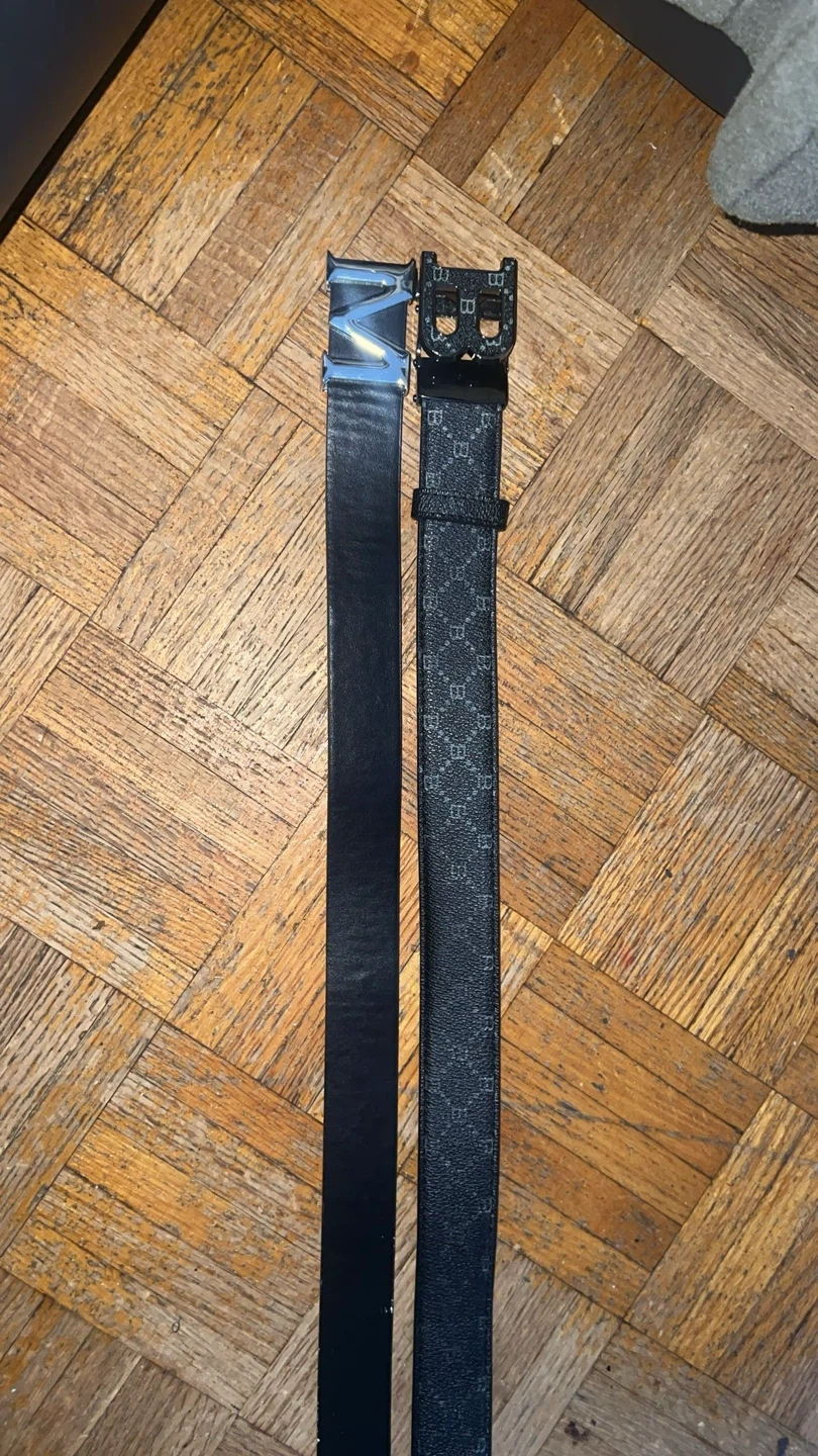Two black belts are included in this set. One is a classic leather belt with a silver buckle. The other features a repeating pattern and a black buckle. They're ready to add a touch of style to any outfit!