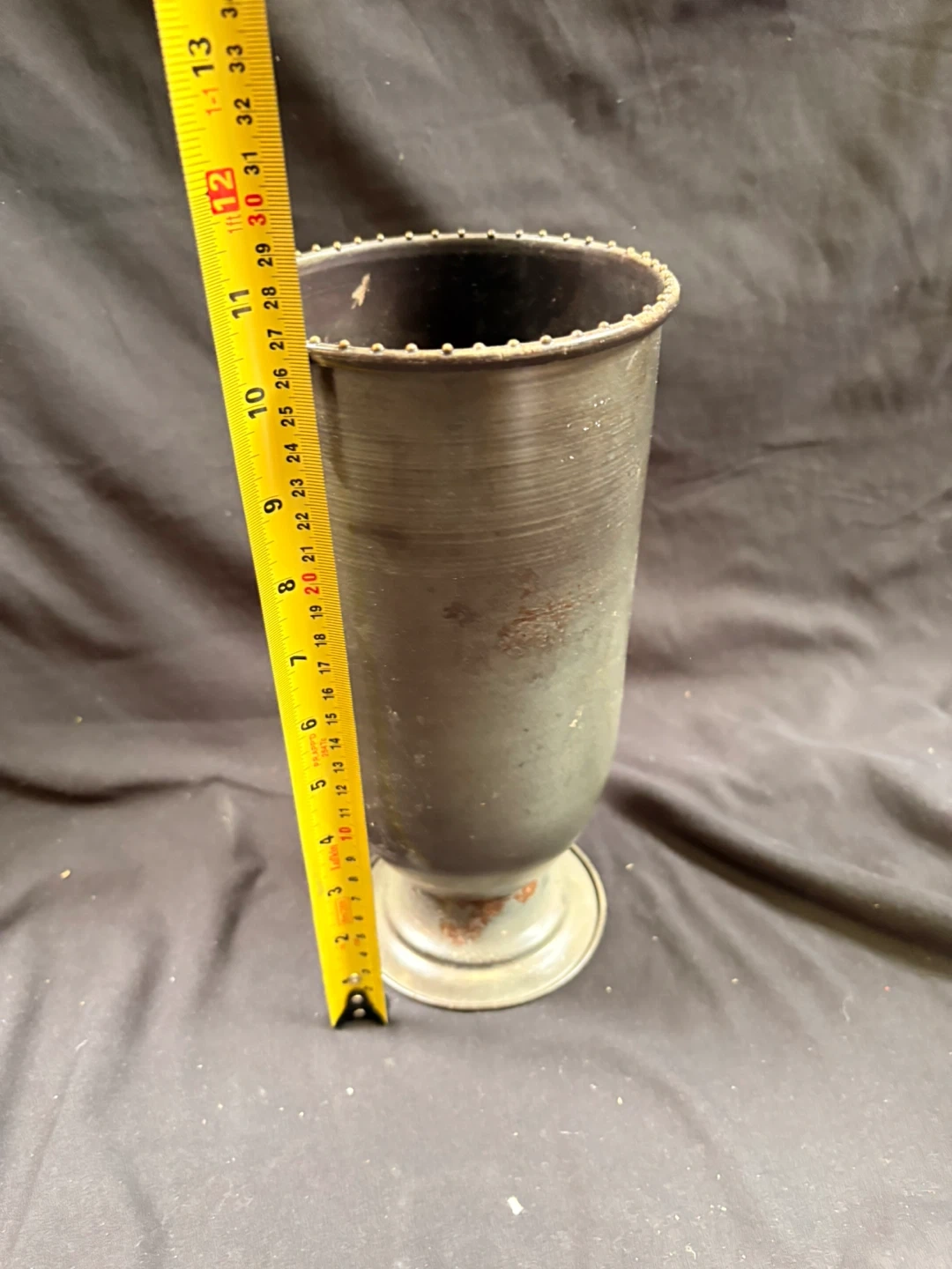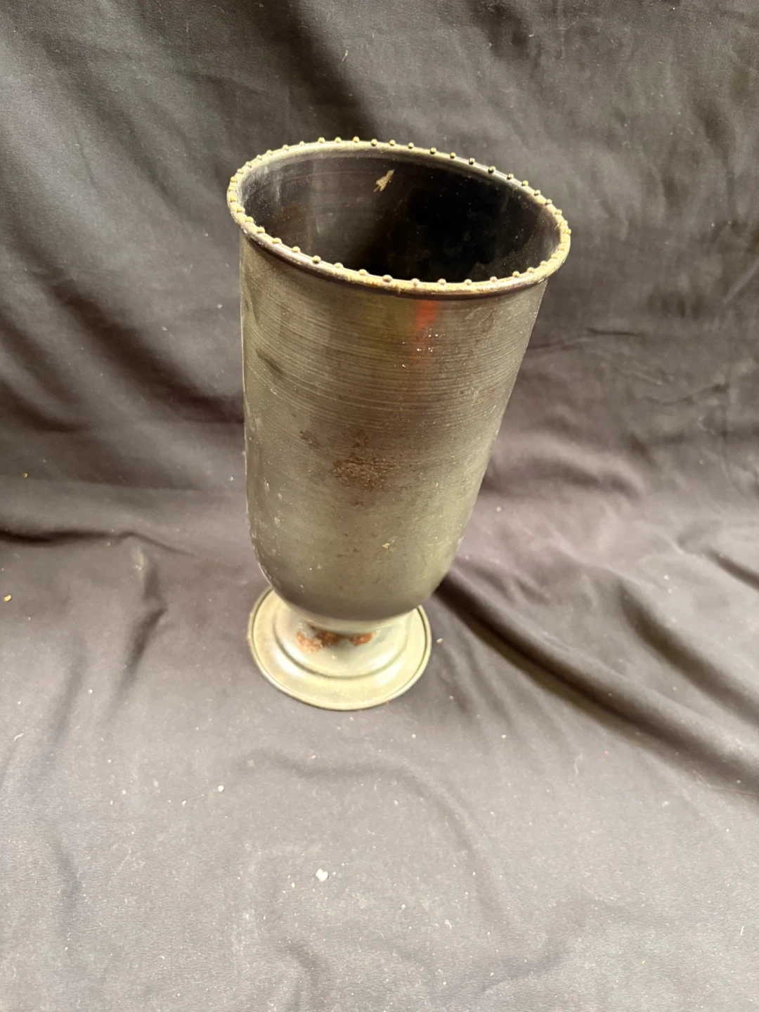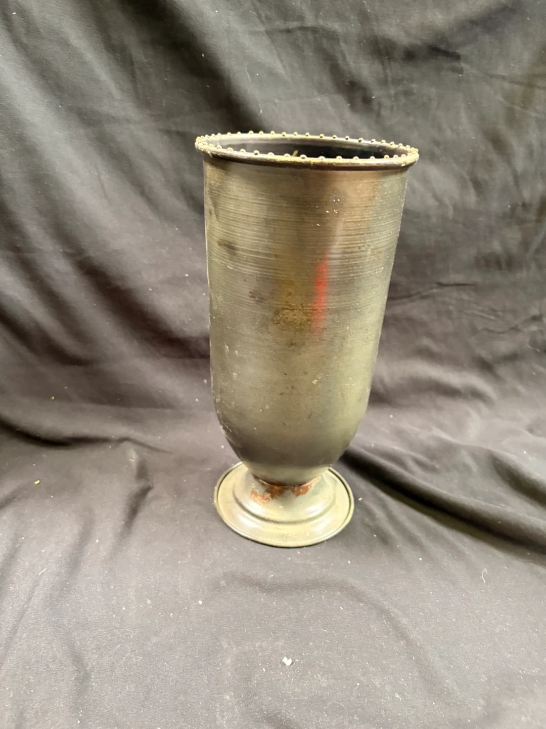 This is a vintage metal vase with a pedestal base. It has some signs of wear and minor rust, consistent with its age. The top rim has decorative beading. It's approximately 10 inches tall.