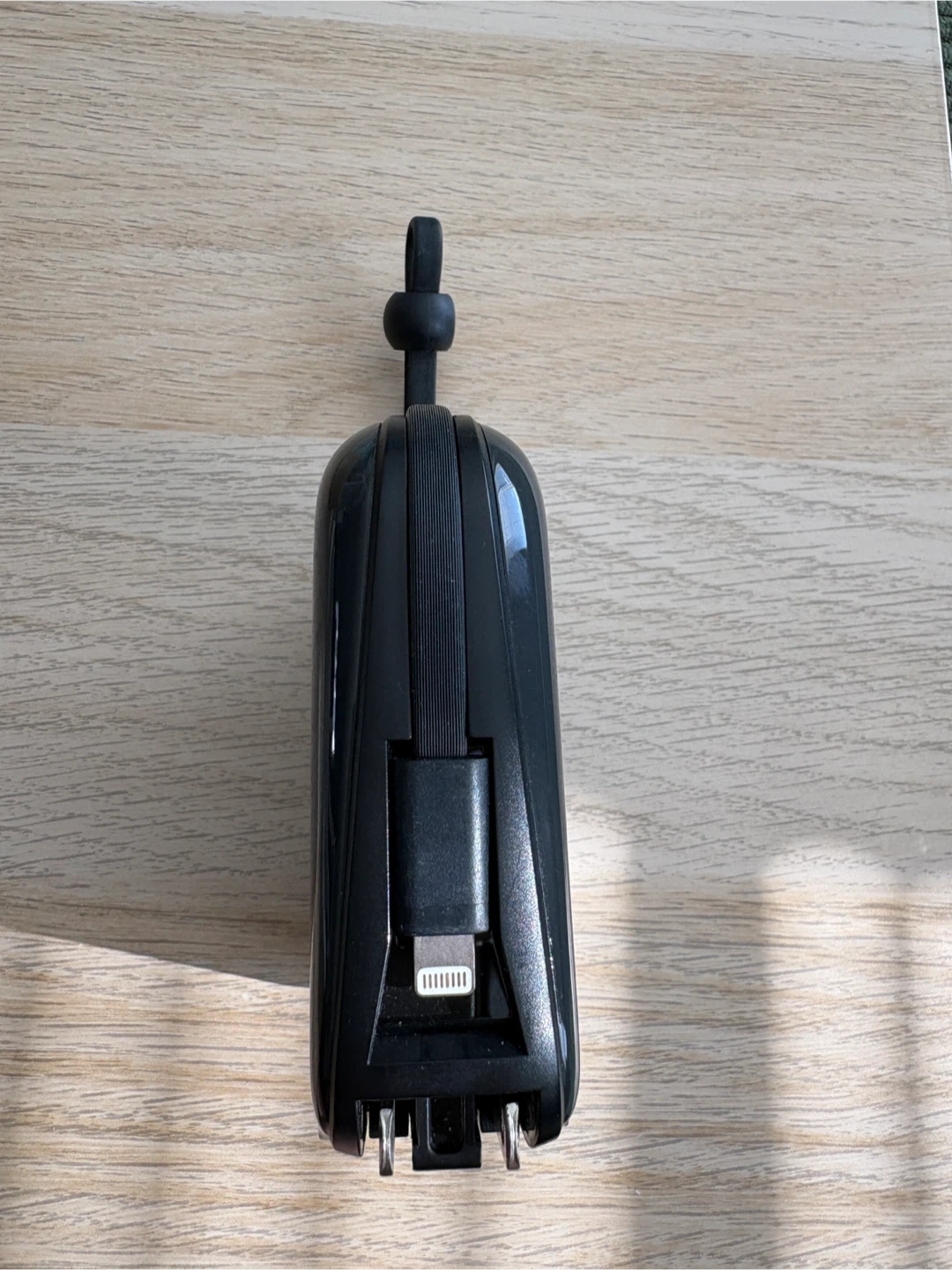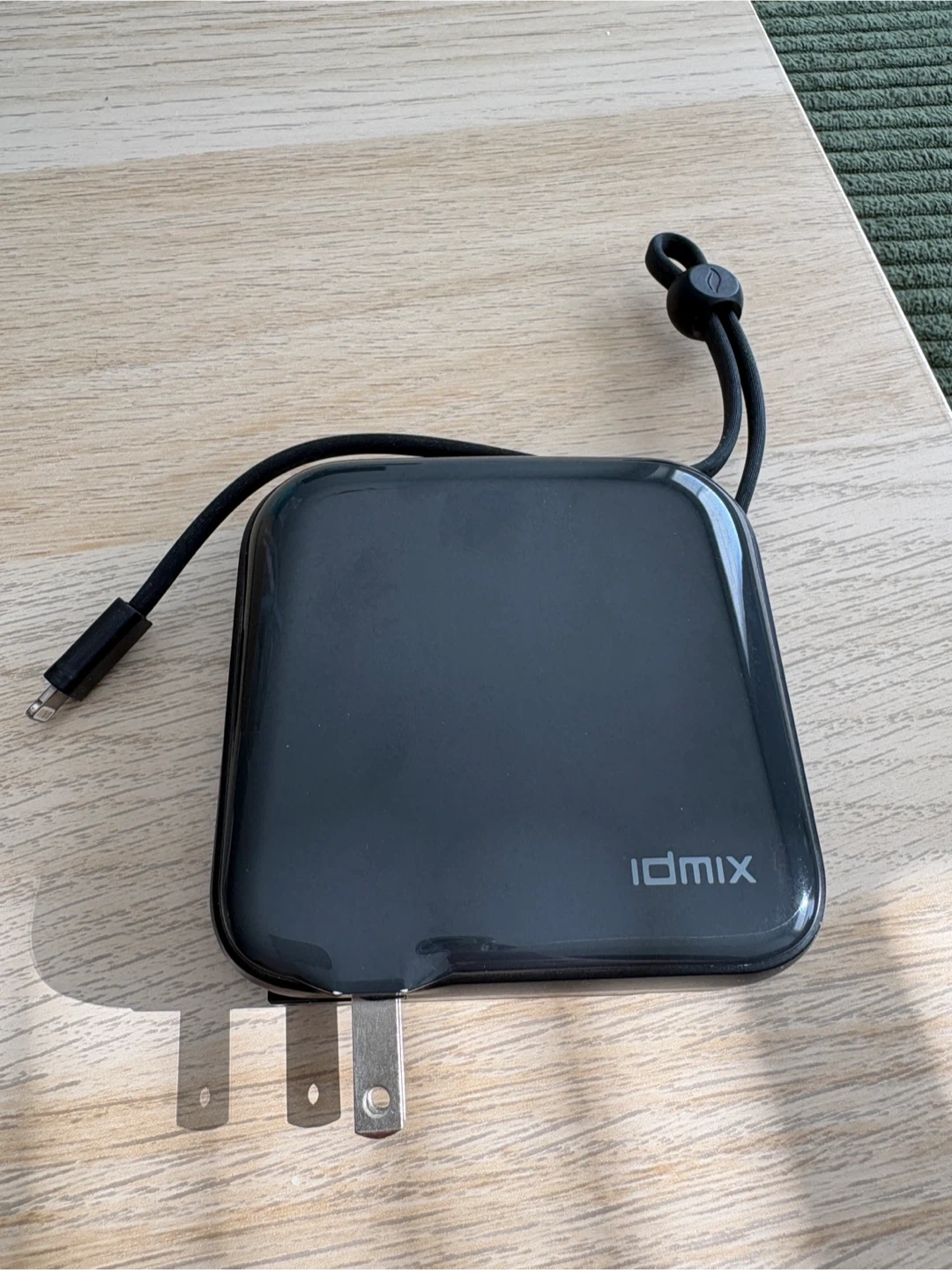 This IDMIX travel charger has a 10000mAh capacity and built-in AC plugs. It features two USB-A ports for charging devices. It's a black colour and is great for travel!