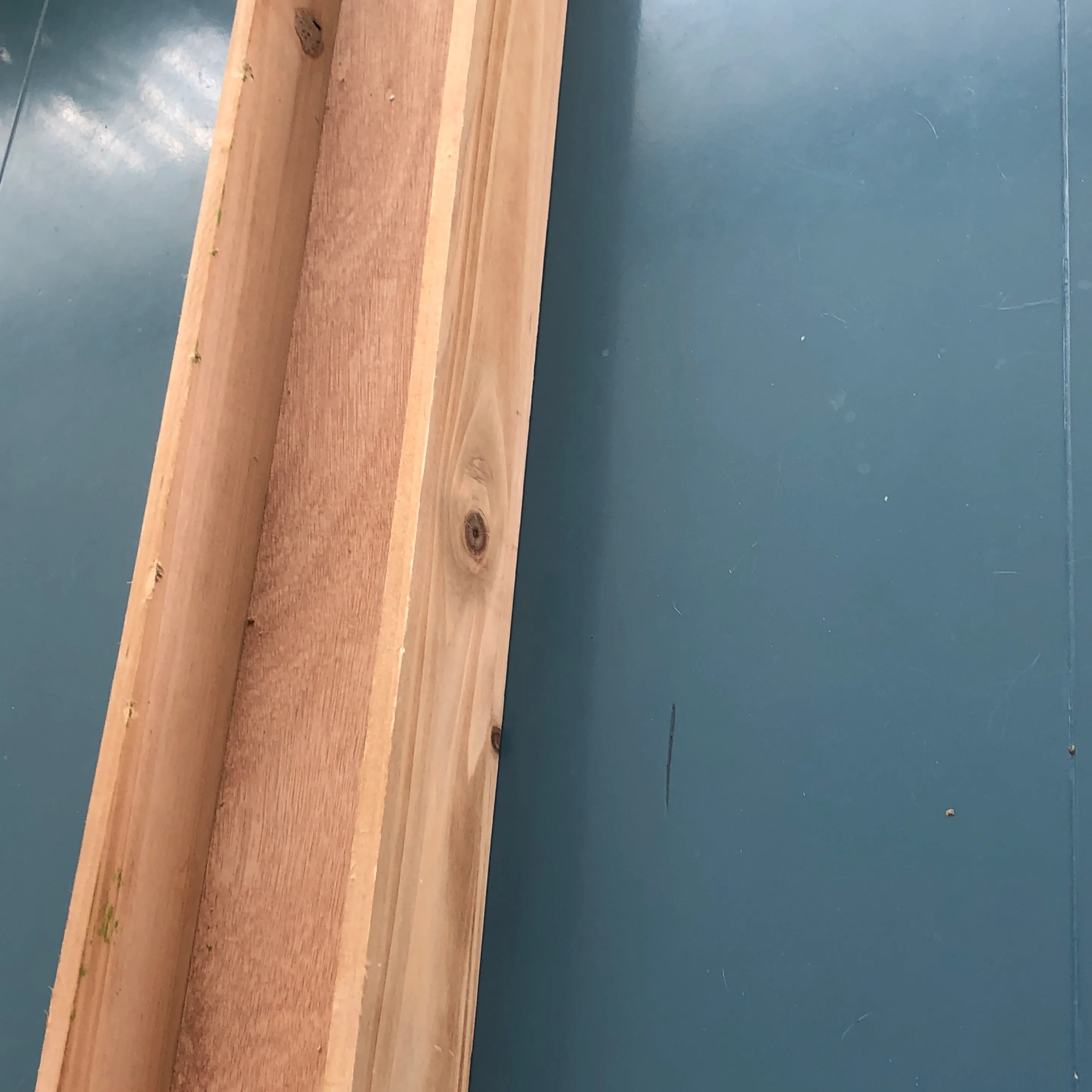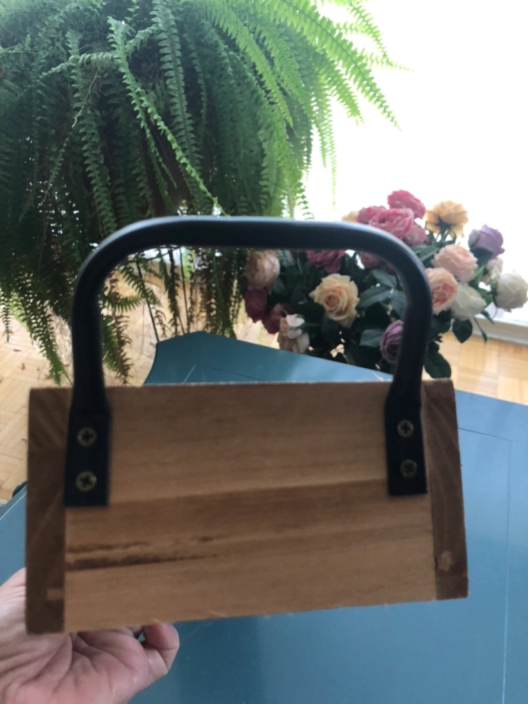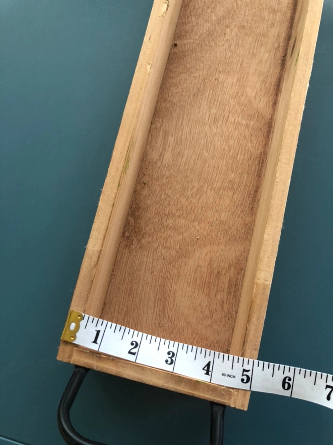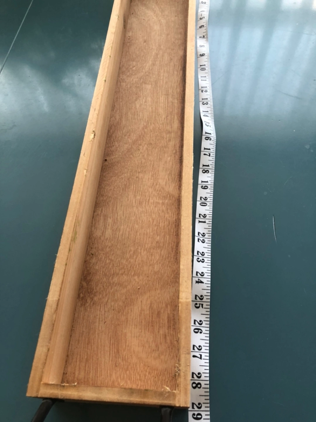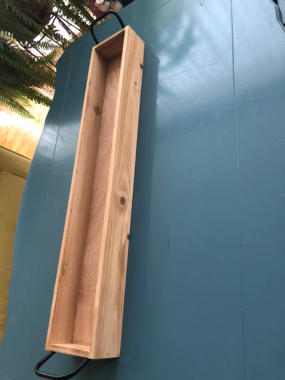 Rustic wooden tray, perfect for displaying or organizing items. Features a long rectangular shape and black metal handles. Measures approximately 29 in length.