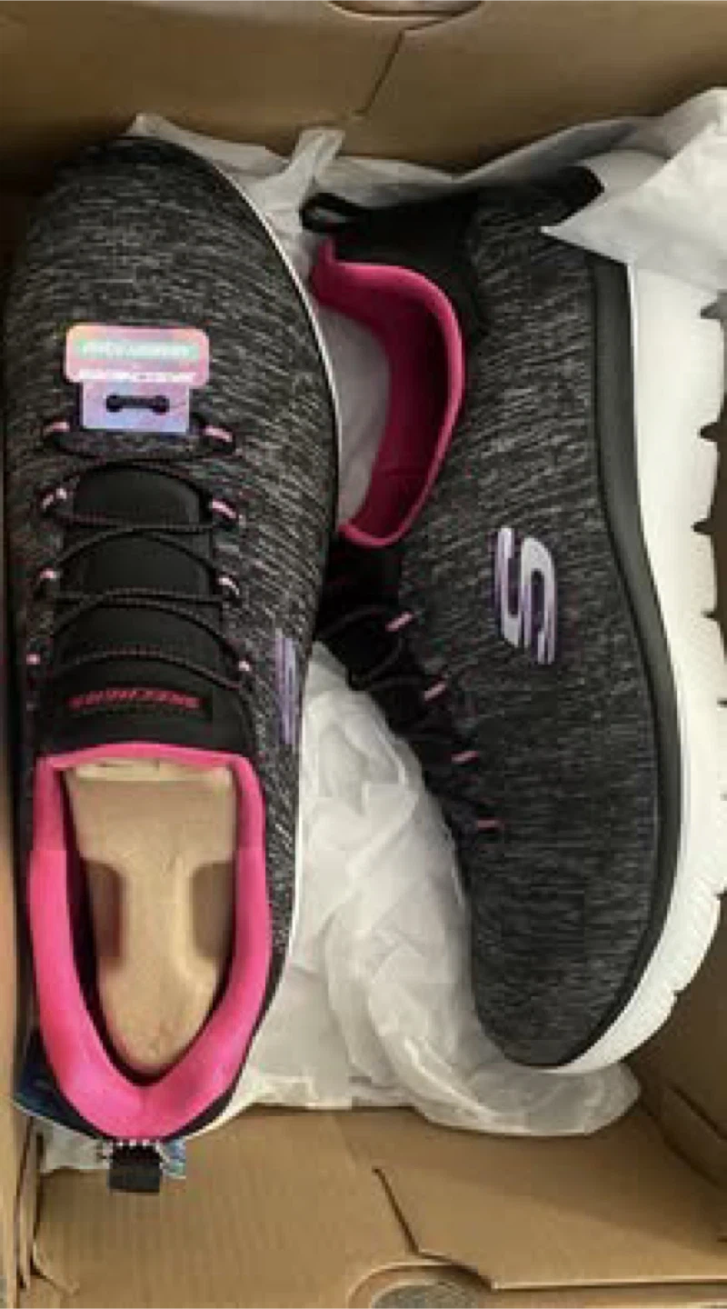 These Skechers running shoes are black and pink with a heathered grey knit upper. They feature a comfortable lace-up design and a supportive white sole. Perfect for your daily runs or walks!