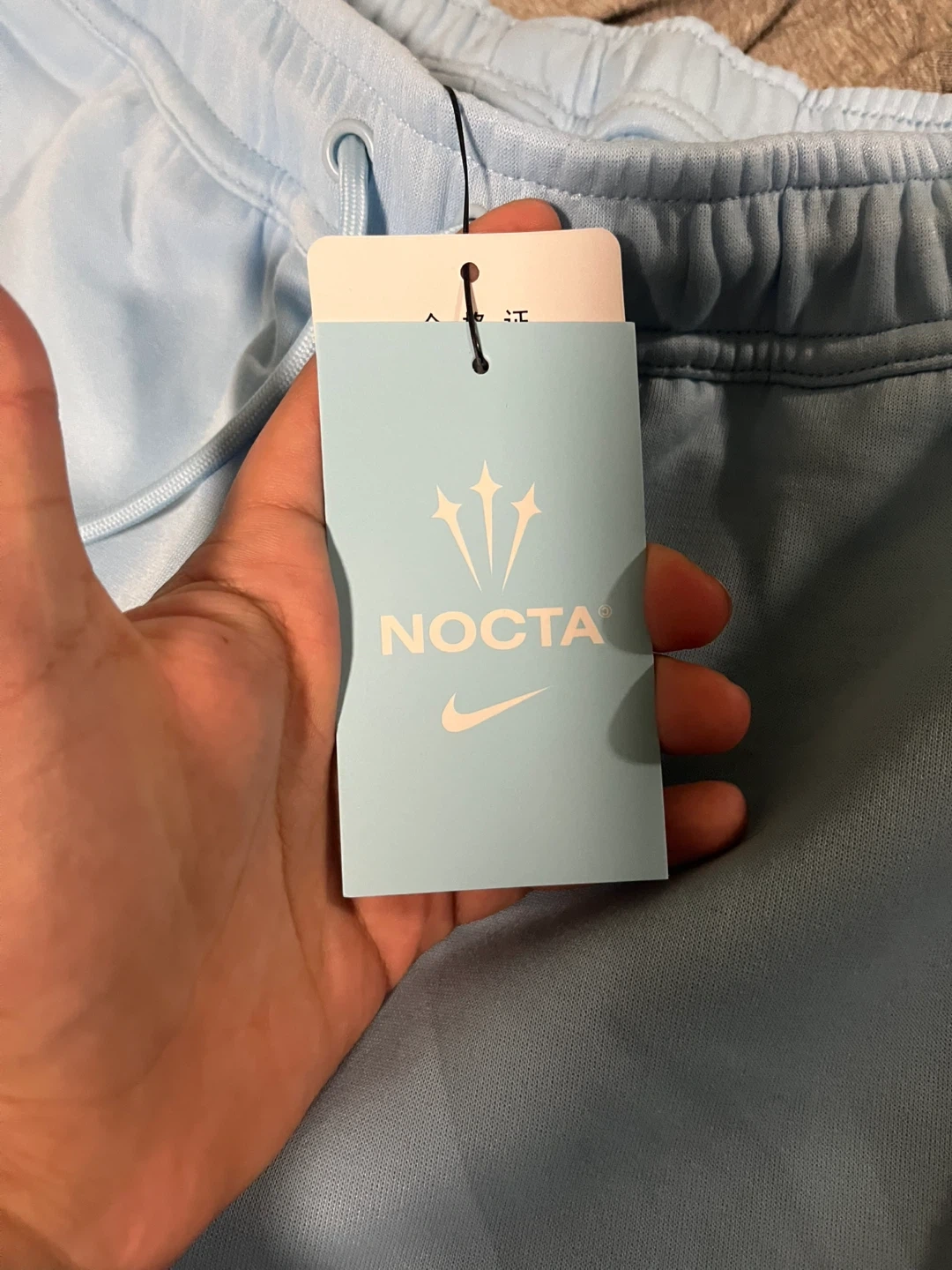 Selling a pair of light blue Nike x NOCTA track pants. These are in great condition and feature the NOCTA logo. Perfect for casual wear or workouts!