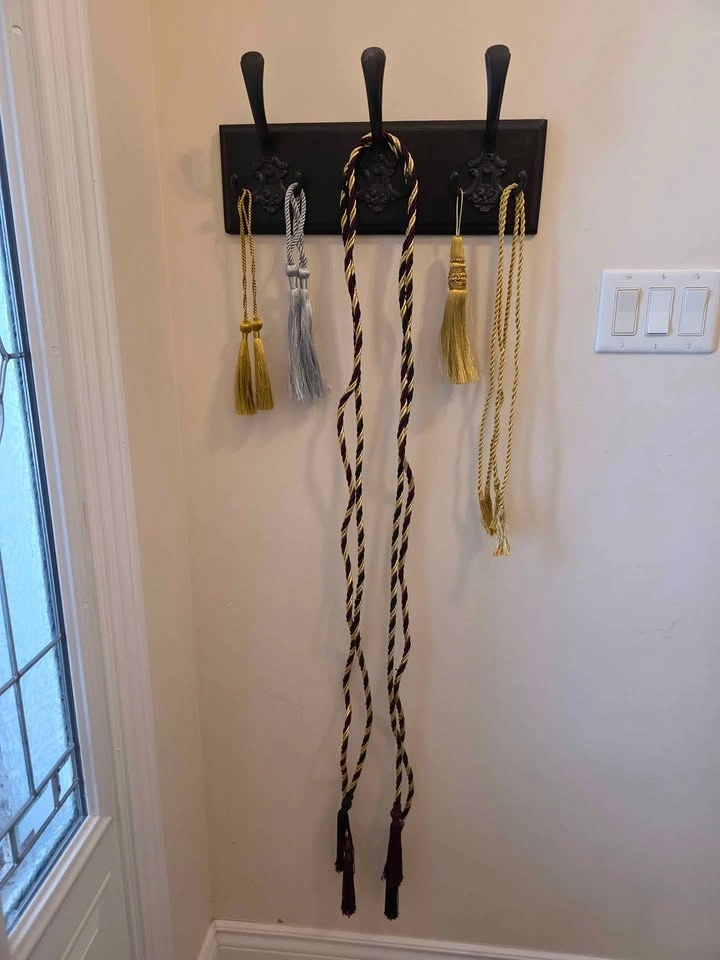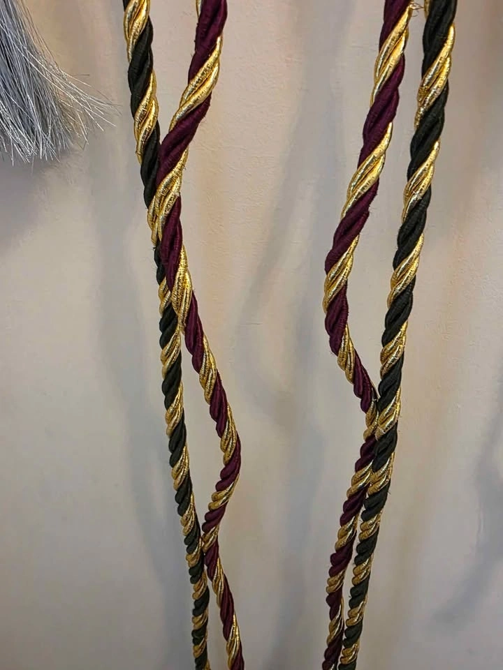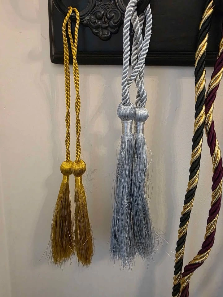 9 piece Holiday Metallic Rope Garland and Tassel Lot. Two 8 foot long Rope garlands. One burgundy and one green with metallic gold. Two 12" metallic silver tassels. Two 12" metallic gold tassels. One 10" metallic gold tassel with beads. Two 42" metallic gold double Rope with tassels. Smoke/pet free home. Pick up west end of Peterborough. $10