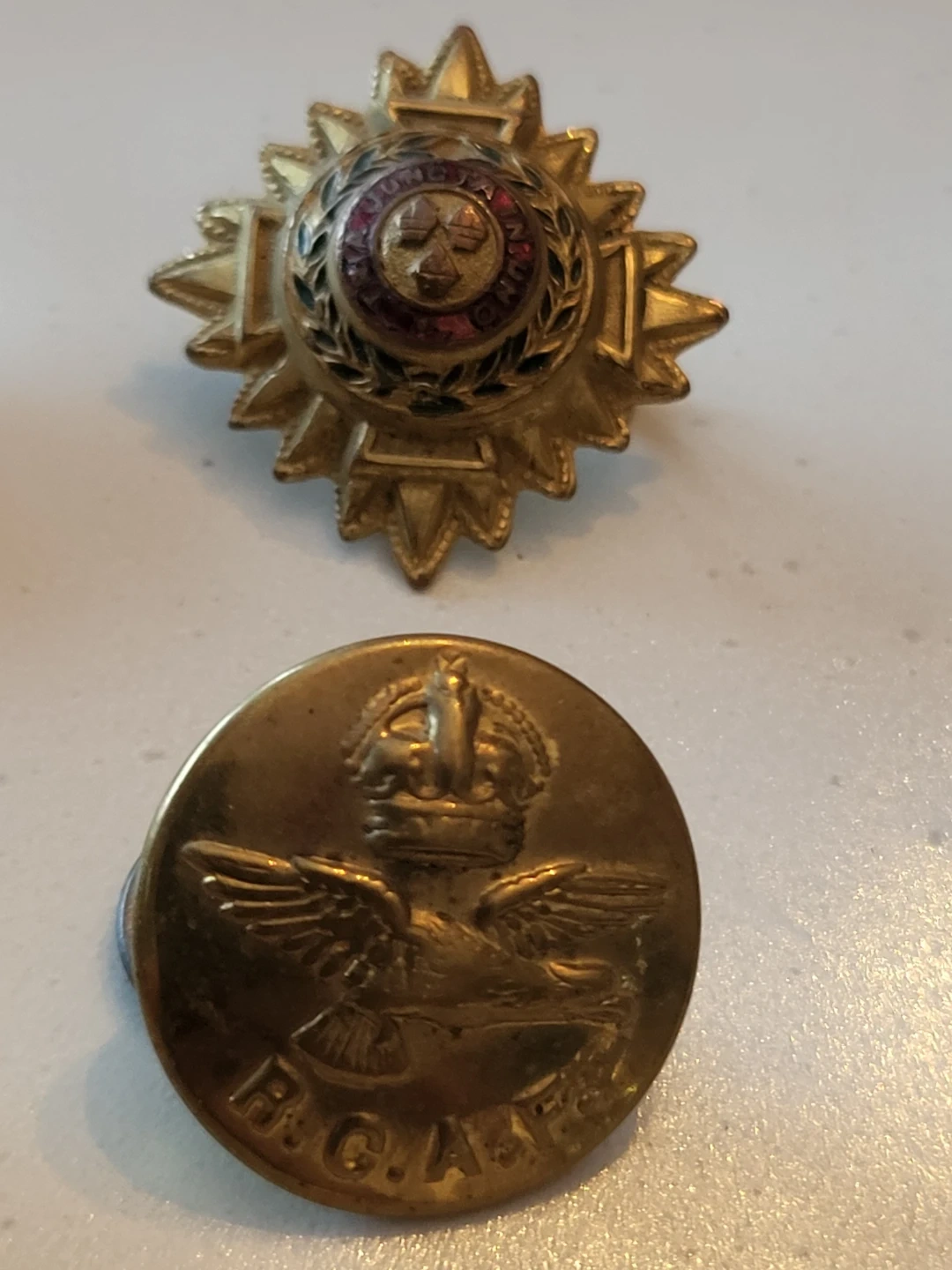 A mixed lot of vintage Canadian military badges and buttons. Includes examples from RCAF and Royal Canadian Ordnance Corps. These are collectible military insignia.