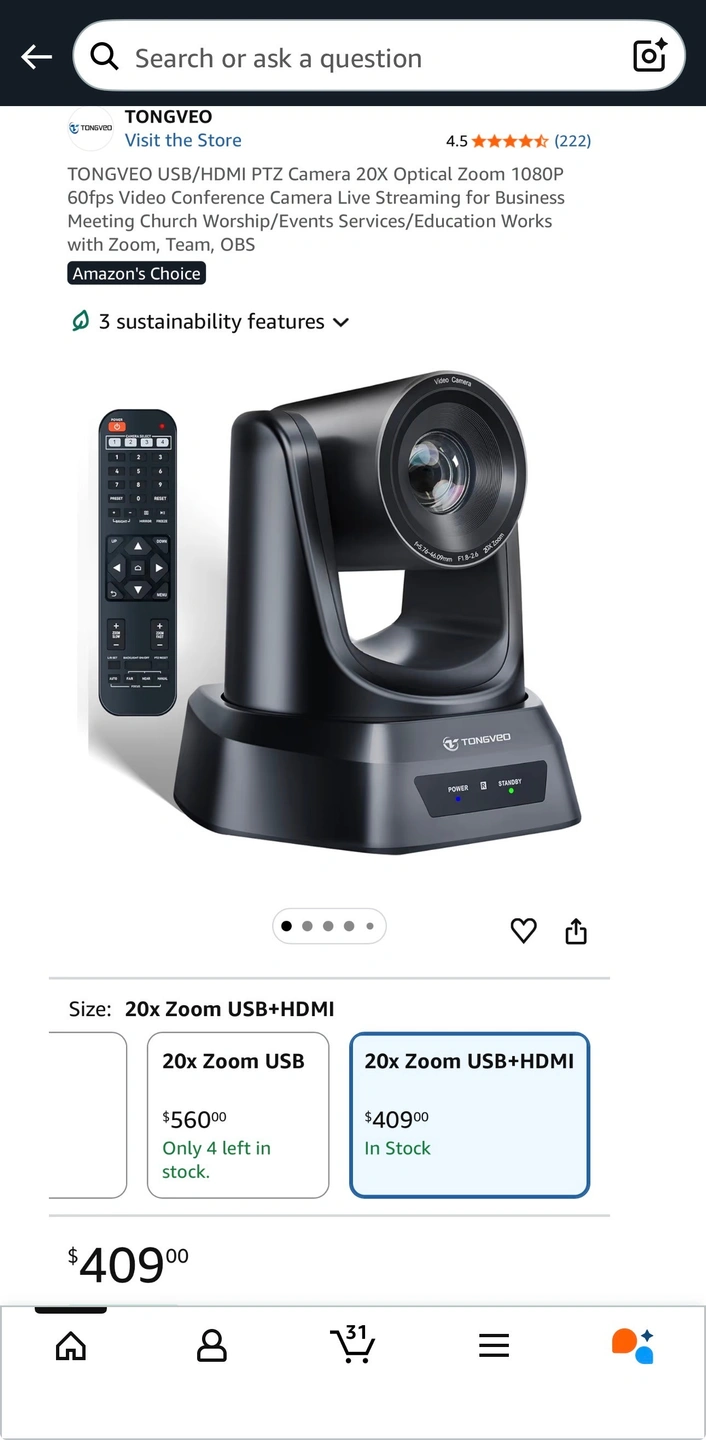 USB/HDMI PTZ Camera 20X Optical Zoom 1080P 60fps Video Conference Camera Live Streaming for Business Meeting Church Worship/Events Services/Education Works with Zoom, Team, OBS
