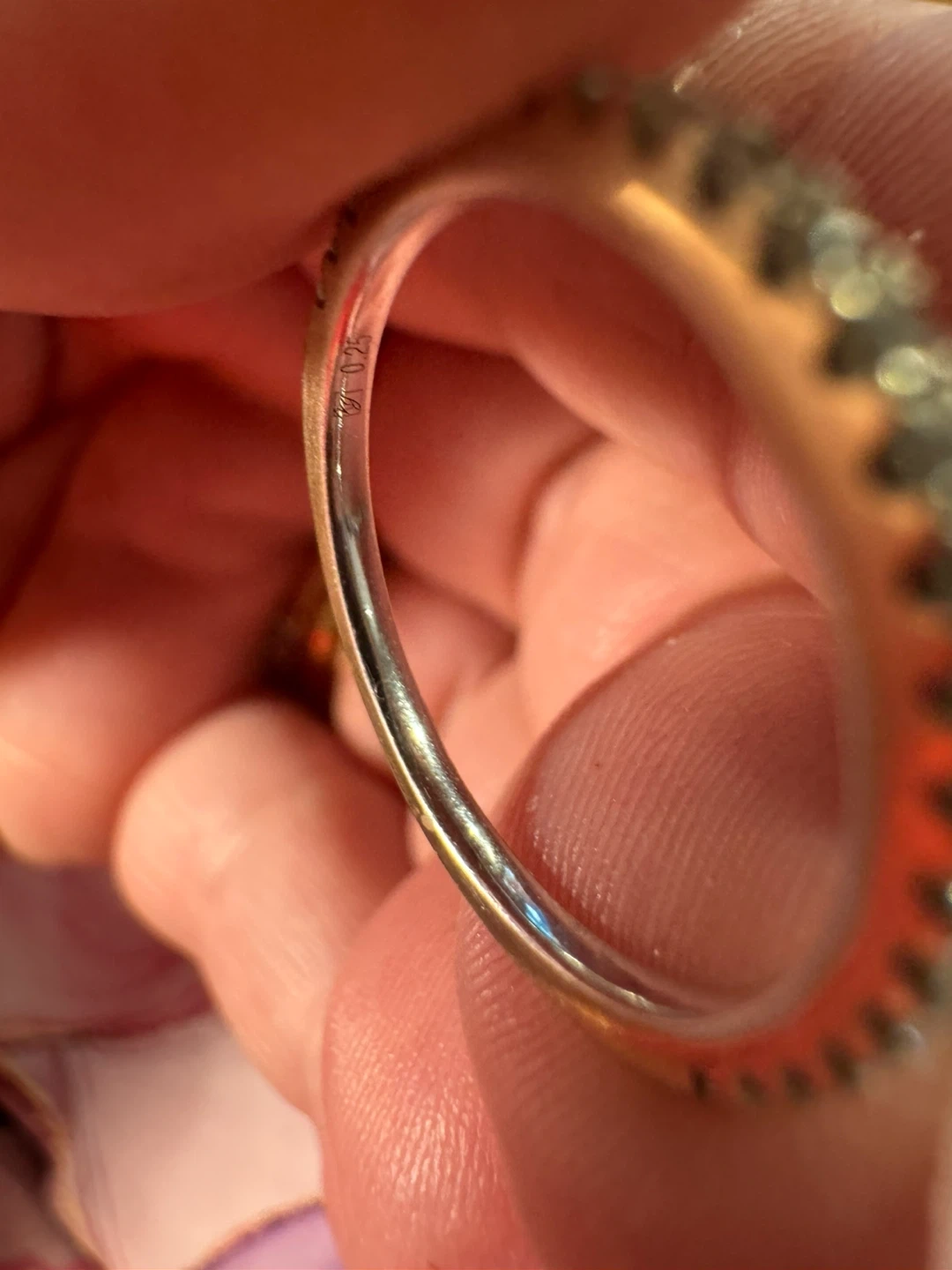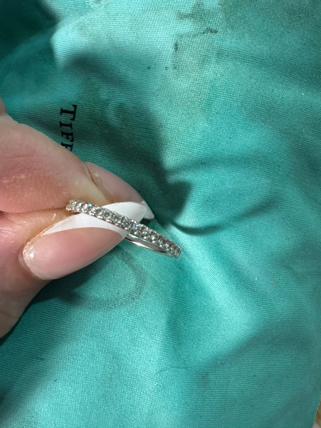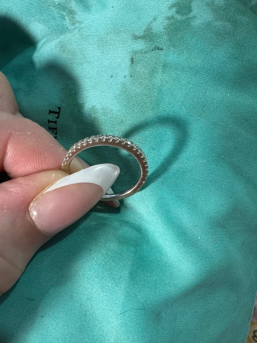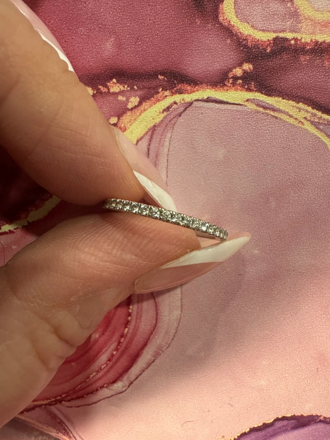 This is a beautiful 18K gold eternity ring. It's set with numerous small diamonds for a full circle of sparkle. The band is thin and elegant, making it perfect for stacking or wearing on its own.