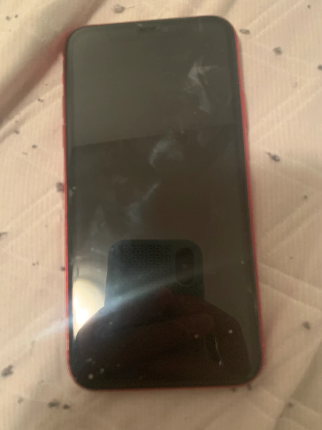 This is an Apple iPhone 11 in red. It features a dual-camera system and a 6.1-inch Liquid Retina display. It's powered by the A13 Bionic chip.