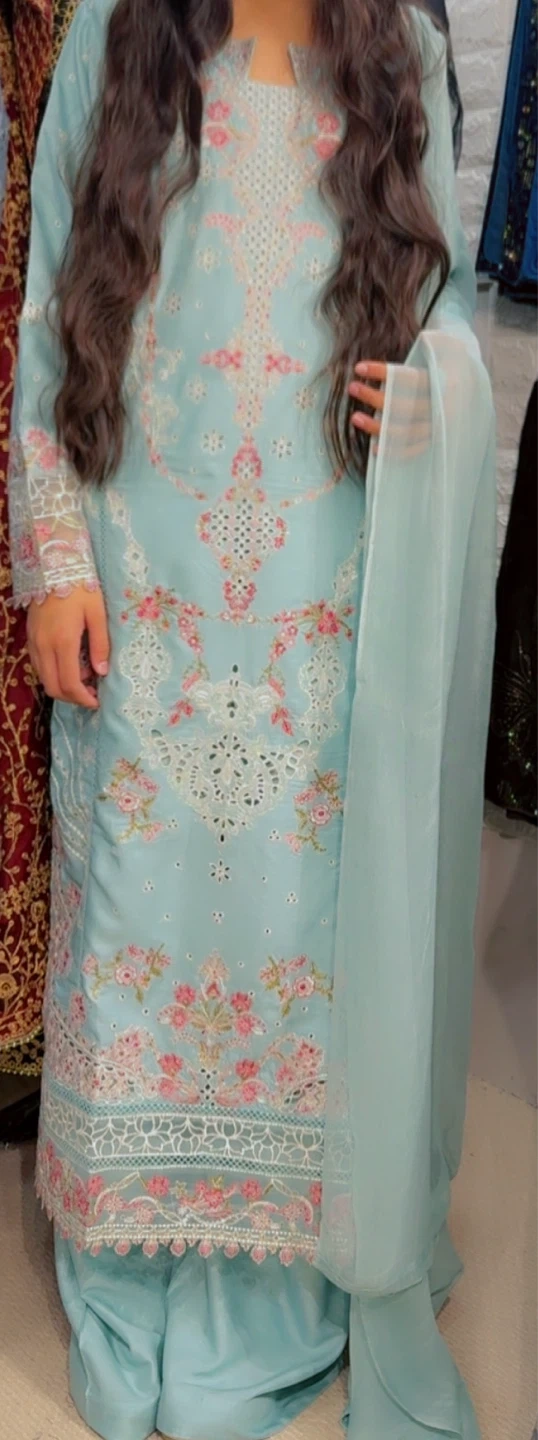Selling a beautiful salwar kameez suit. The suit is a lovely light blue colour with floral embroidery detailing. Perfect for special occasions or everyday wear!