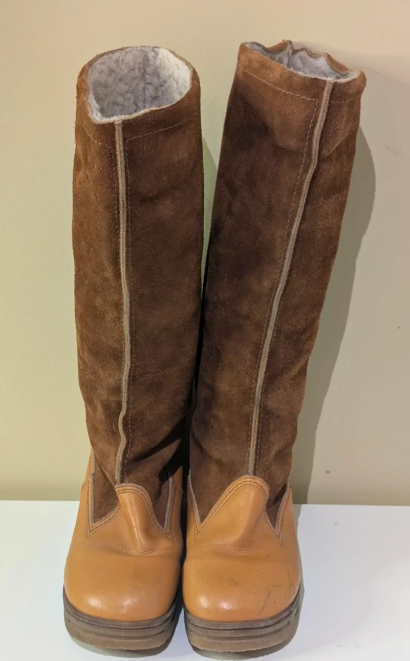 Cozy winter boots with a soft, shearling-style lining. Features a mix of suede and leather in a classic brown colour.