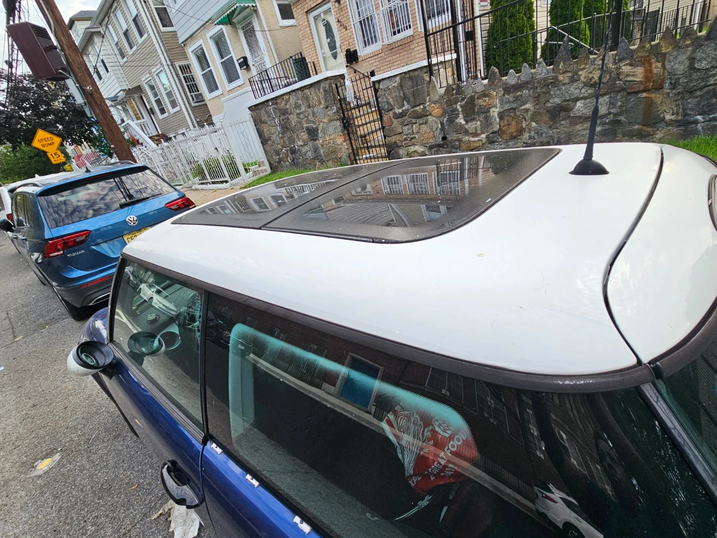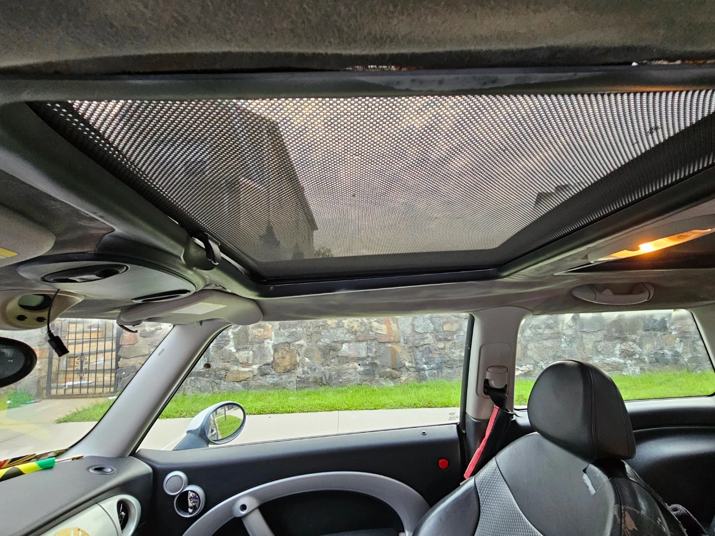 This listing includes interior parts from a Mini Cooper. It has leather seats and a panoramic sunroof. Also visible is the dashboard with the original Mini Cooper radio and gear shifter.