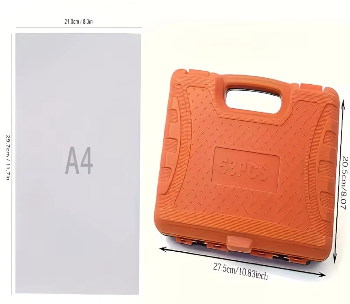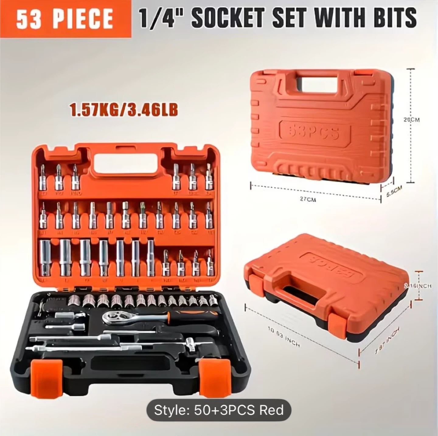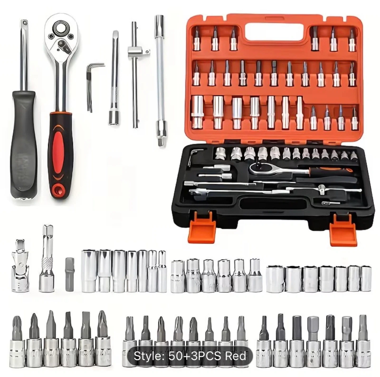 This is a 56-piece tool set with a ratchet wrench and various sockets and bits. It comes in a durable orange and black carrying case. This set is great for general repairs and maintenance.