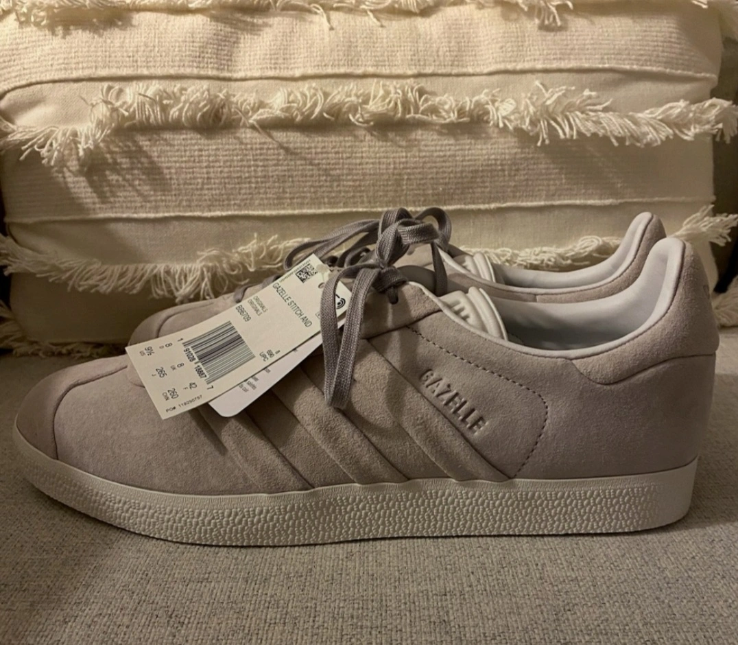 These sneakers have a neutral, light gray colour. Suede uppers with signature three stripes.