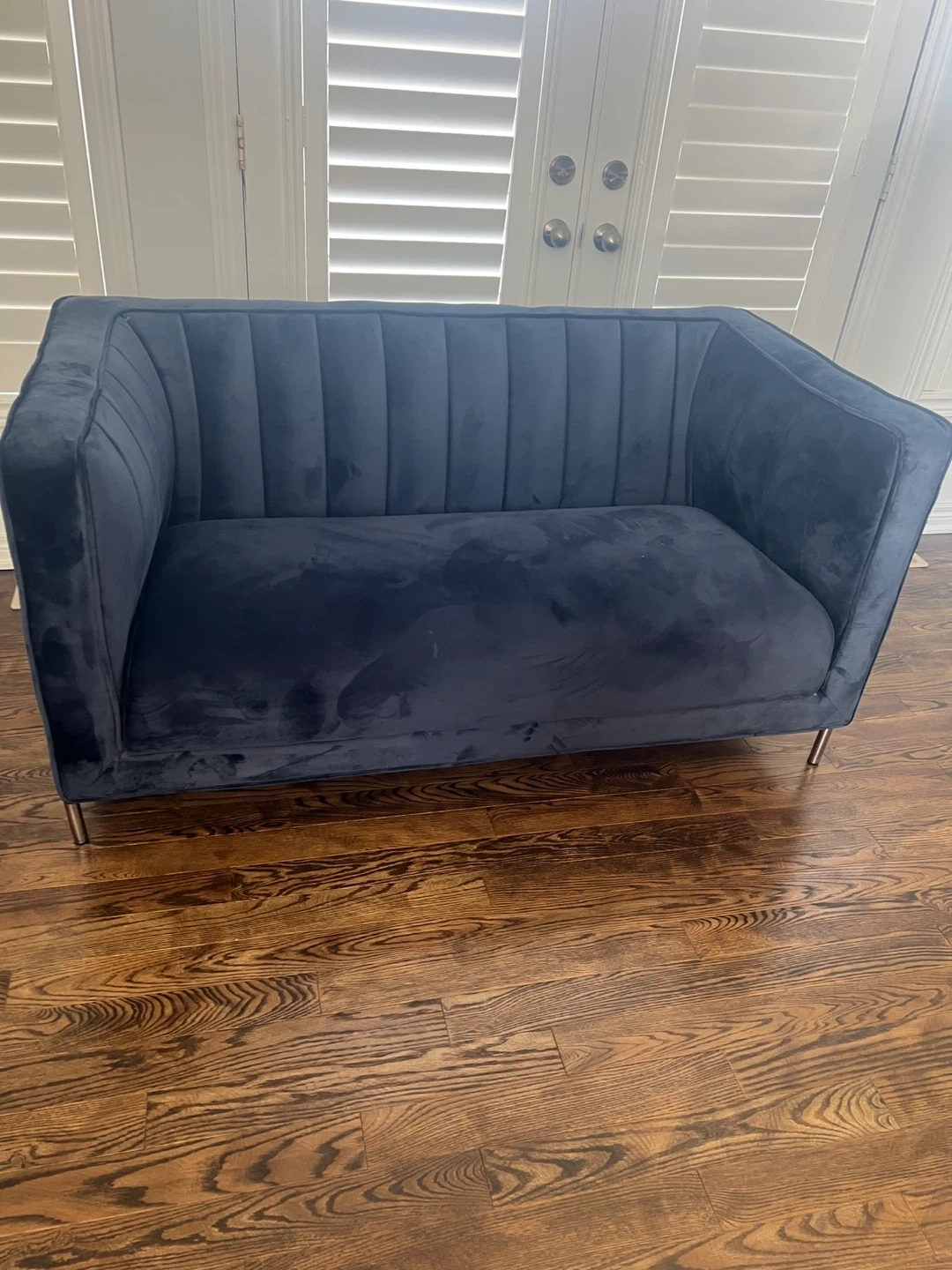 Stylish navy velvet loveseat with channel tufting. It's upholstered in soft velvet with a channel-tufted back. The modern design includes sleek metal legs. This loveseat's compact size makes it a great addition to smaller spaces.