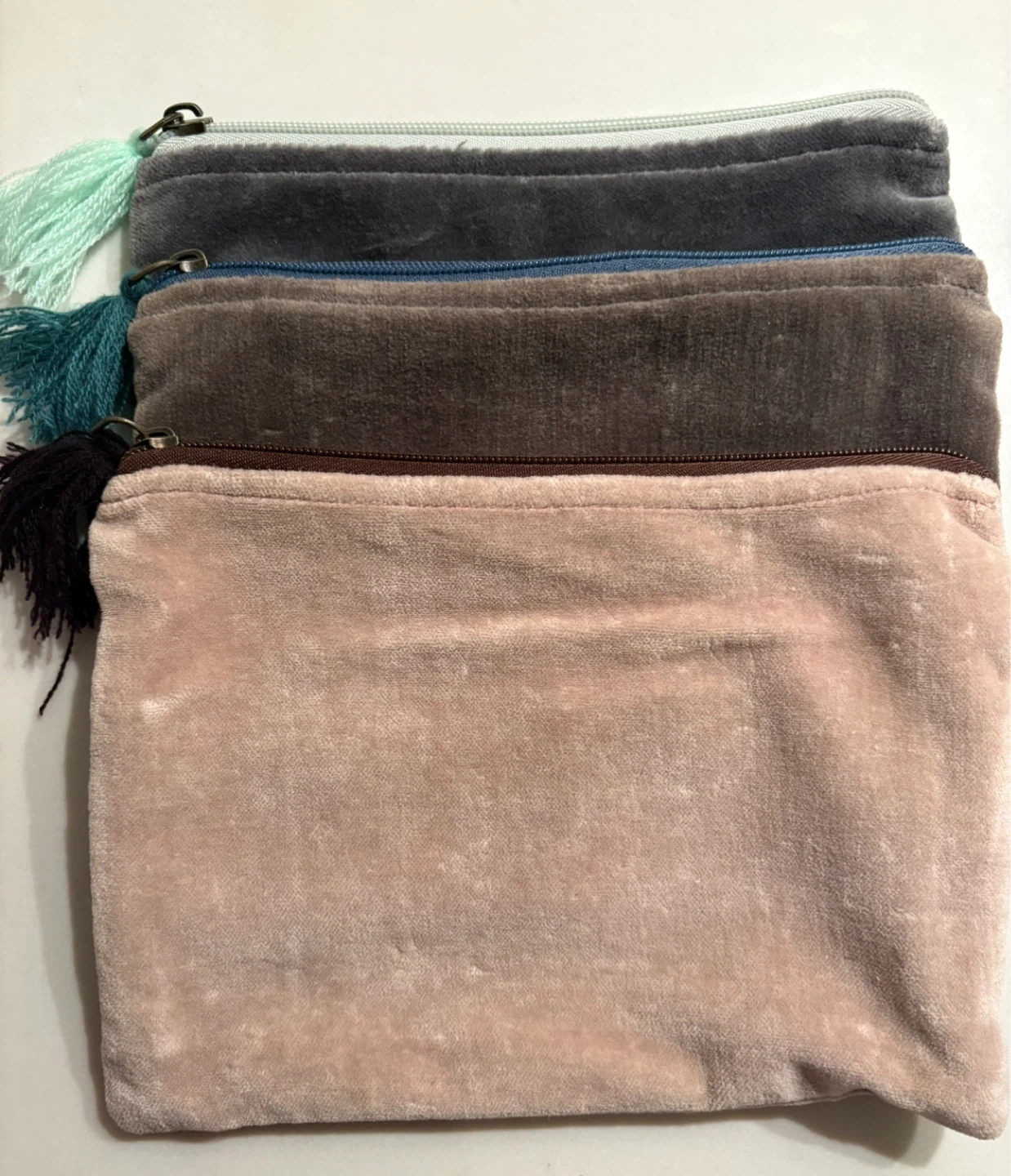 Set of 3 Indaba velvet zipper pouches with tassel zipper pulls. One in light pink, one in mushroom/olive green and one in teal/greyish green.