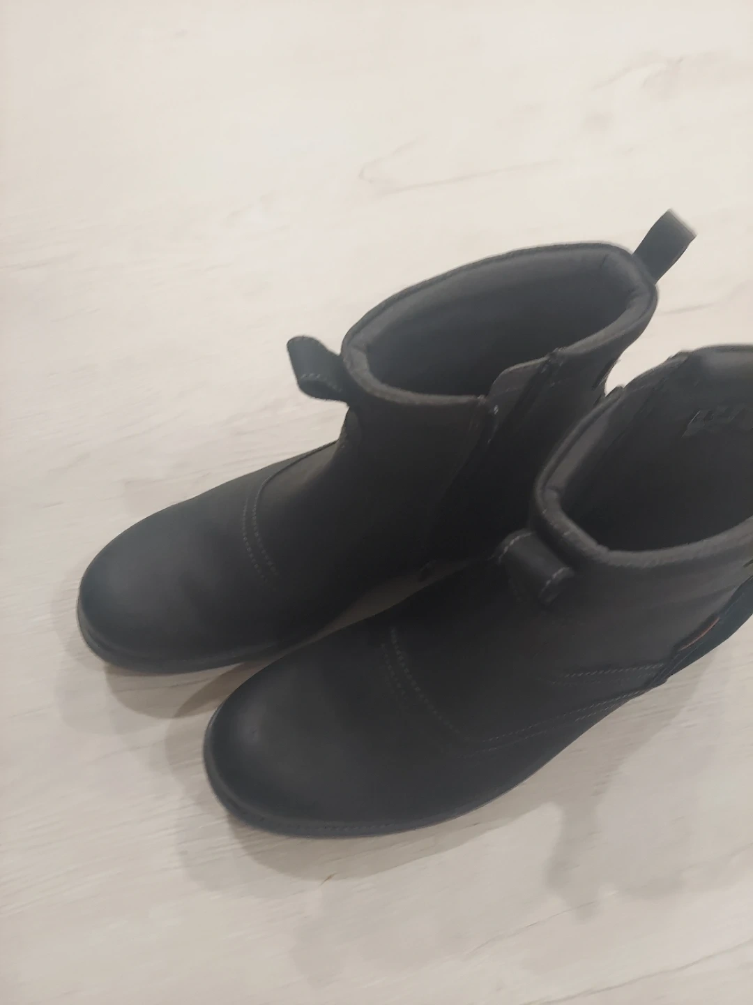 These Clarks ankle boots are made of black leather. They feature a side zip closure and pull tabs for easy on and off. The EU size is 44 and the US size is 10.5.