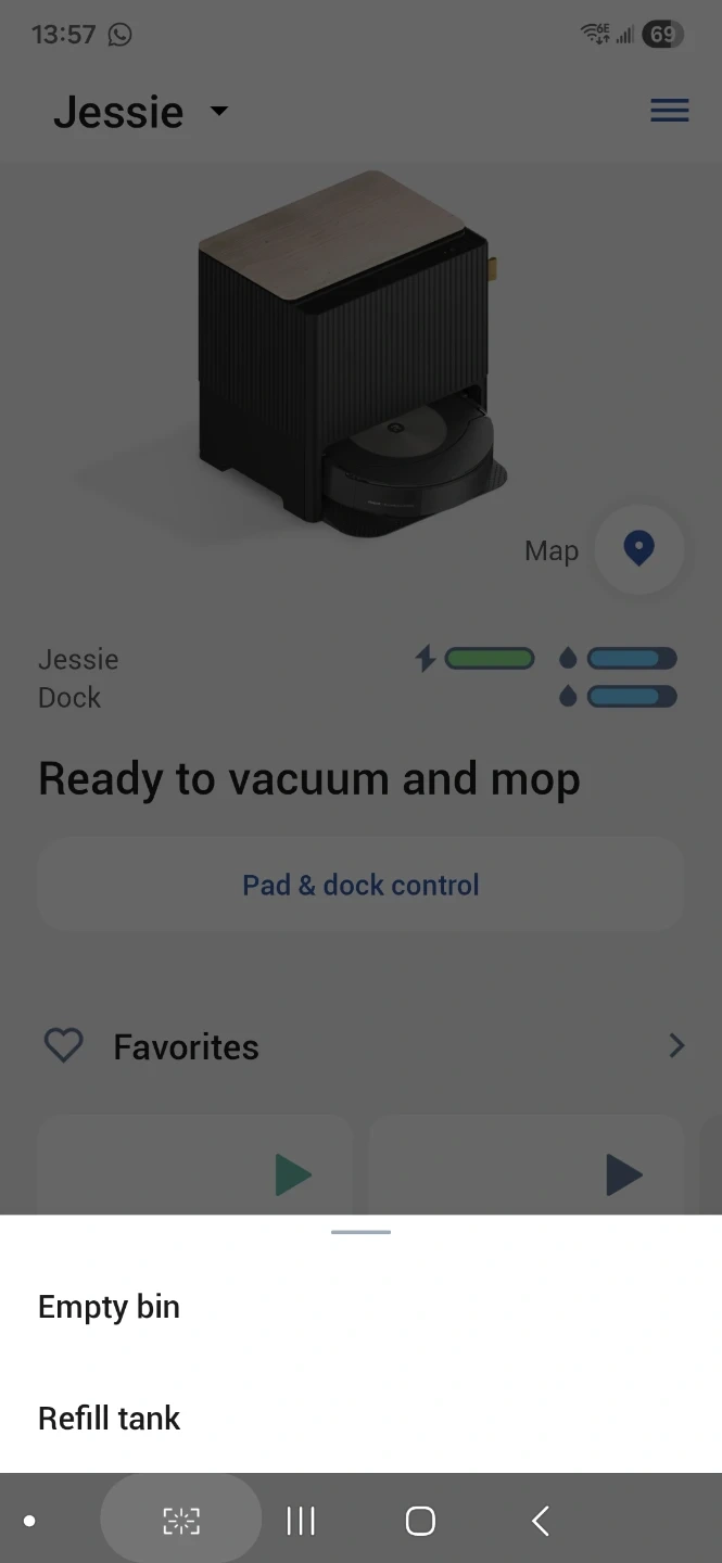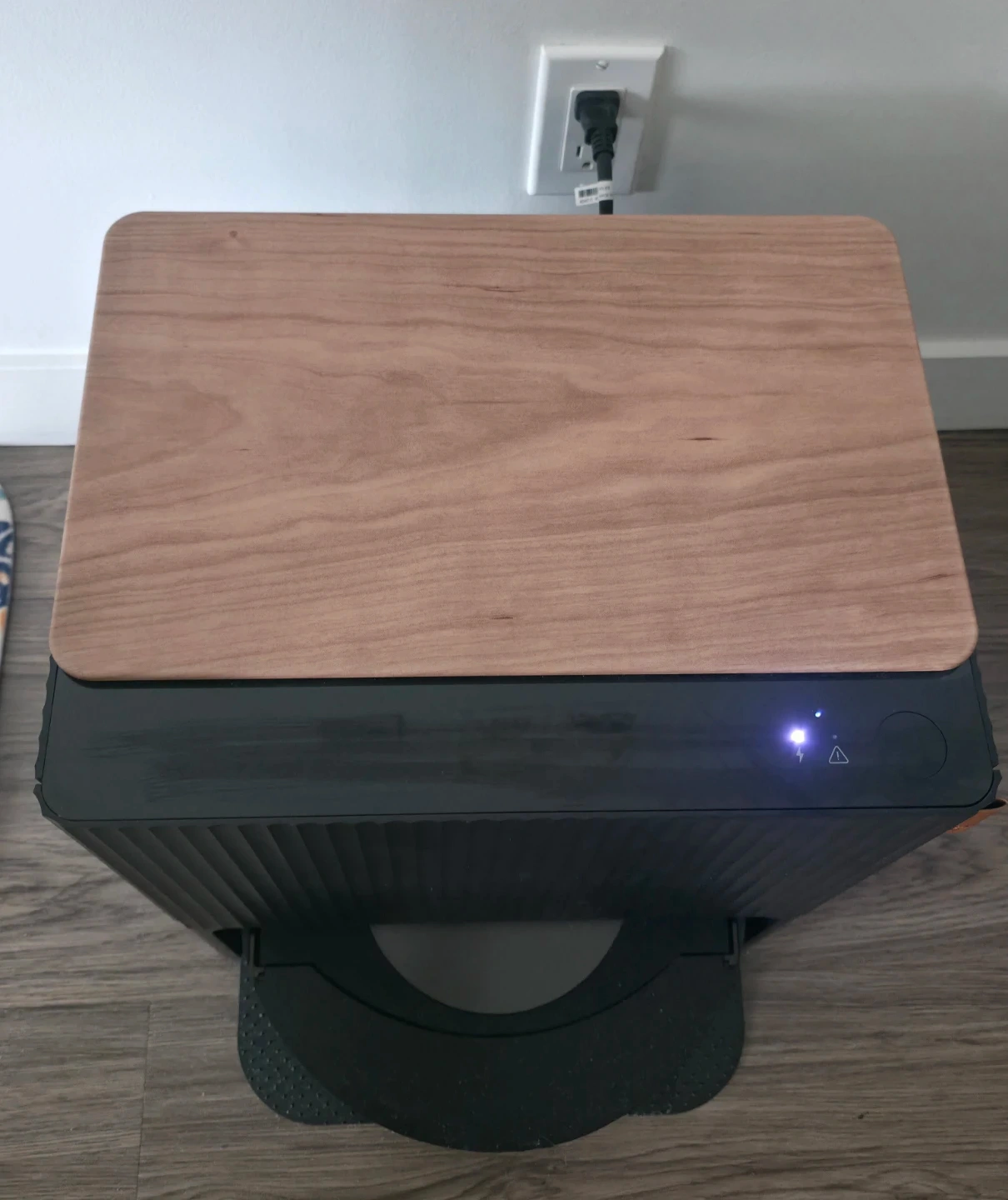 This is a dock for an iRobot Roomba vacuum. It's designed to empty the bin and refill the tank. It features a modern wood-grain top.